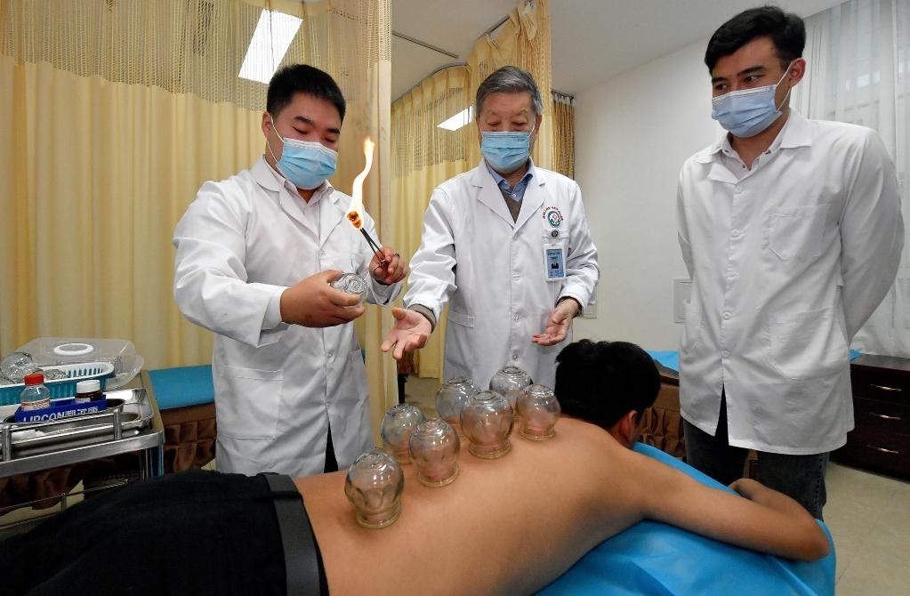 2020年11月10日,陜西中醫(yī)藥大學(xué)針灸推拿學(xué)院教授賈成文(中)在指導(dǎo)馬文軒(右)進(jìn)行拔罐。新華社記者 劉瀟 攝