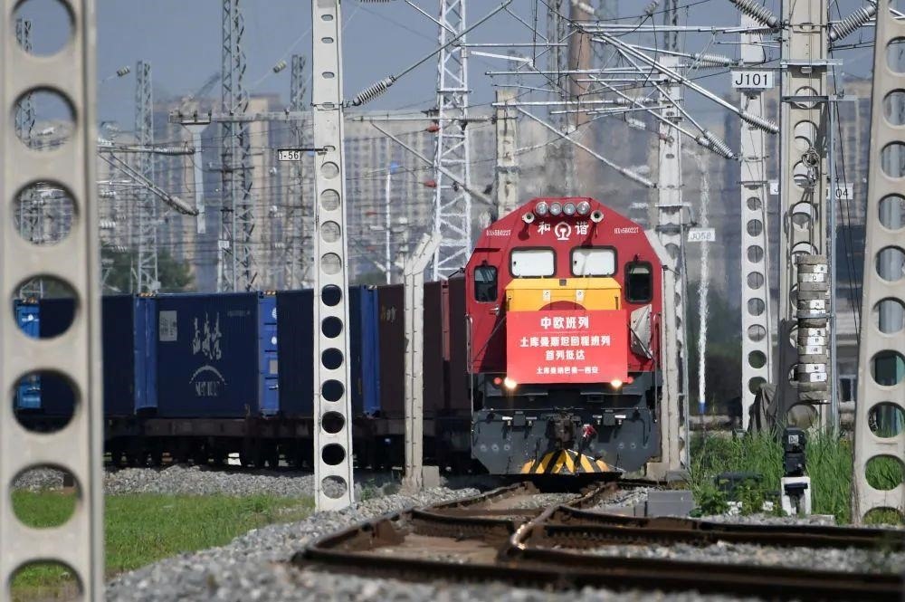 △載有土庫曼斯坦甘草中藥材原料的中歐班列回程列車抵達西安國際港站(2022年8月31日攝)。