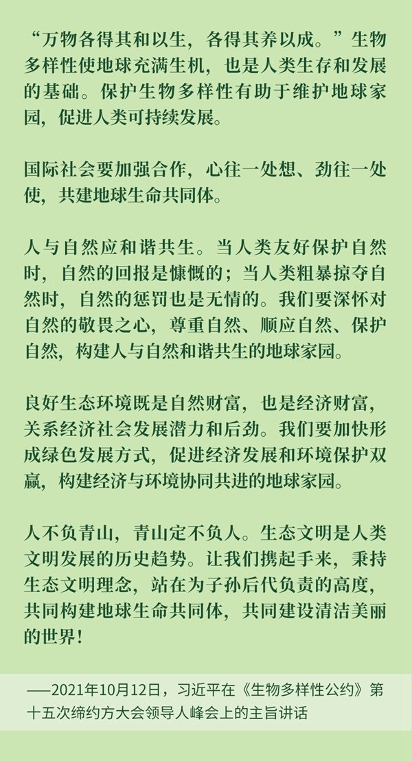 今天,讓我們重溫習(xí)近平主席講話金句,進(jìn)一步認(rèn)識(shí)生物多樣性保護(hù)的重要性,以實(shí)際行動(dòng)保護(hù)我們的地球家園。