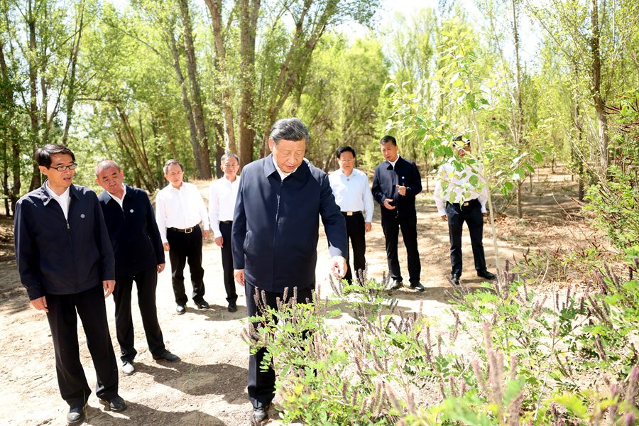 2023年6月5日至6日,中共中央總書記、國家主席、中央軍委主席習(xí)近平在內(nèi)蒙古巴彥淖爾考察,并主持召開加強(qiáng)荒漠化綜合防治和推進(jìn)“三北”等重點(diǎn)生態(tài)工程建設(shè)座談會(huì)。這是6日上午,習(xí)近平在臨河區(qū)國營新華林場考察。新華社記者