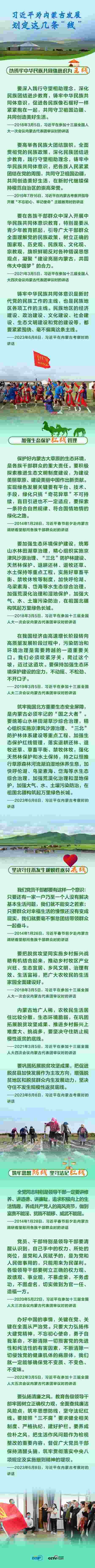 6月8日,習(xí)近平總書記聽取內(nèi)蒙古自治區(qū)黨委和政府工作匯報后發(fā)表講話,強調(diào)內(nèi)蒙古要“以鑄牢中華民族共同體意識為主線”,“加強生態(tài)保護(hù)紅線管理”,“堅決守住不發(fā)生規(guī)模性返貧底線”,“筑牢思想防線,堅守法紀(jì)紅線”。
