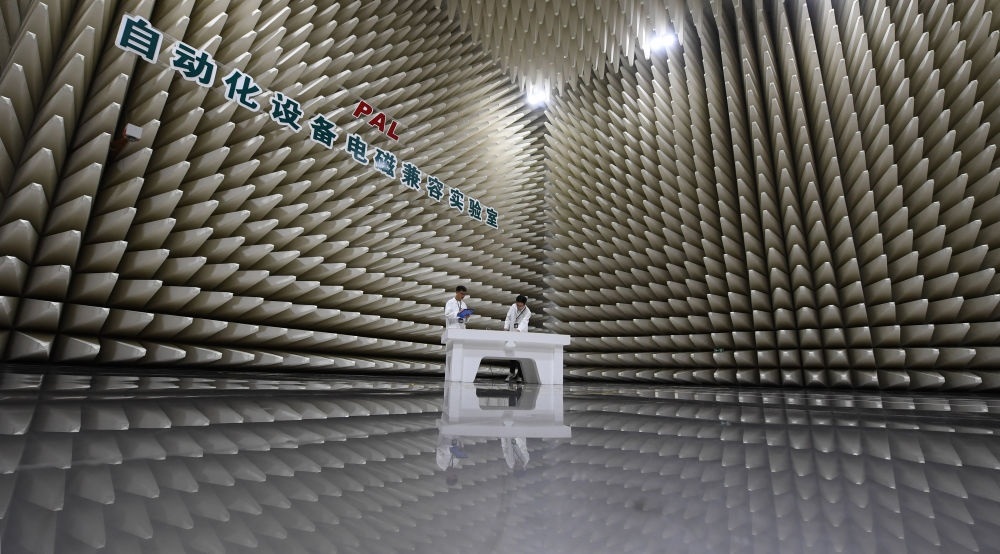 在南瑞集團(tuán)有限公司自動(dòng)化設(shè)備電磁兼容實(shí)驗(yàn)室,科研人員在進(jìn)行輻射發(fā)射實(shí)驗(yàn)準(zhǔn)備工作(2023年7月7日攝)。新華社記者 季春鵬 攝