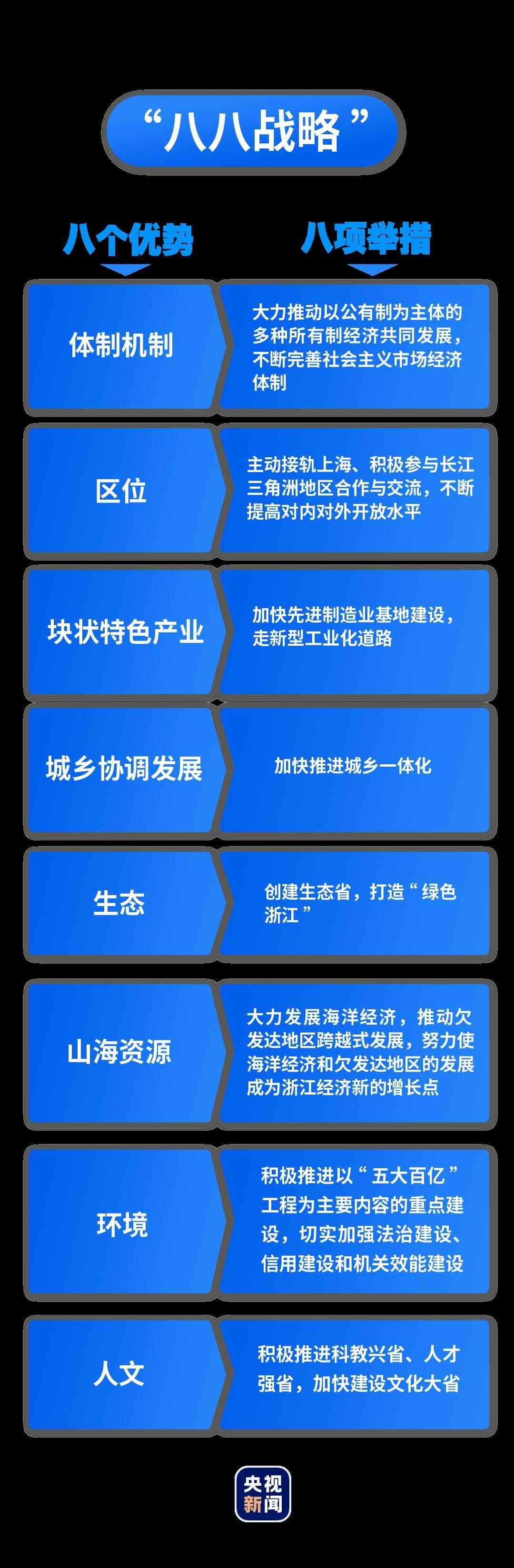 2003年7月10日,浙江省委十一屆四次全體(擴大)會議召開。時任浙江省委書記習近平全面系統(tǒng)闡釋了浙江發(fā)展的“八個優(yōu)勢”,提出了指向未來的“八項舉措”,這就是“八八戰(zhàn)略”。