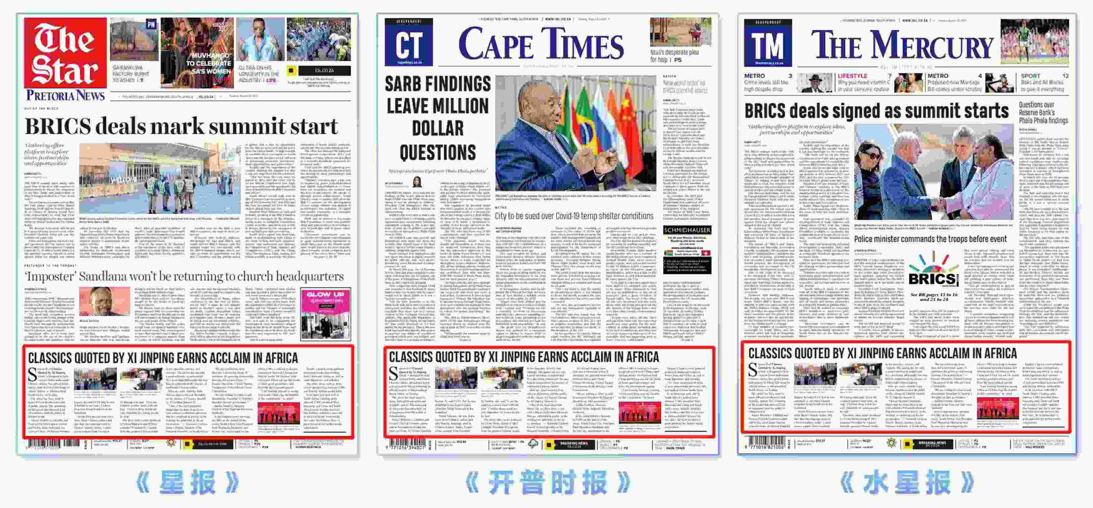 8月22日出版的南非三大主流報(bào)刊南非《星報(bào)》、《開(kāi)普時(shí)報(bào)》、《水星報(bào)》,連續(xù)第二天在頭版顯著位置發(fā)表文章。文章指出,《平“語(yǔ)”近人——習(xí)近平喜歡的典故》第二季周日(8月20日)在南非約翰內(nèi)斯堡正式發(fā)布后,在非洲贏得了廣泛好評(píng)。系列節(jié)目已經(jīng)在多家非洲廣播公司播出,并在公共場(chǎng)所大屏幕展示,這些語(yǔ)錄吸引了大量非洲受眾觀看并獲得積極反響。