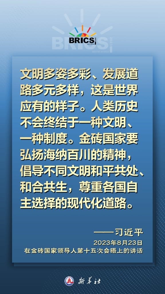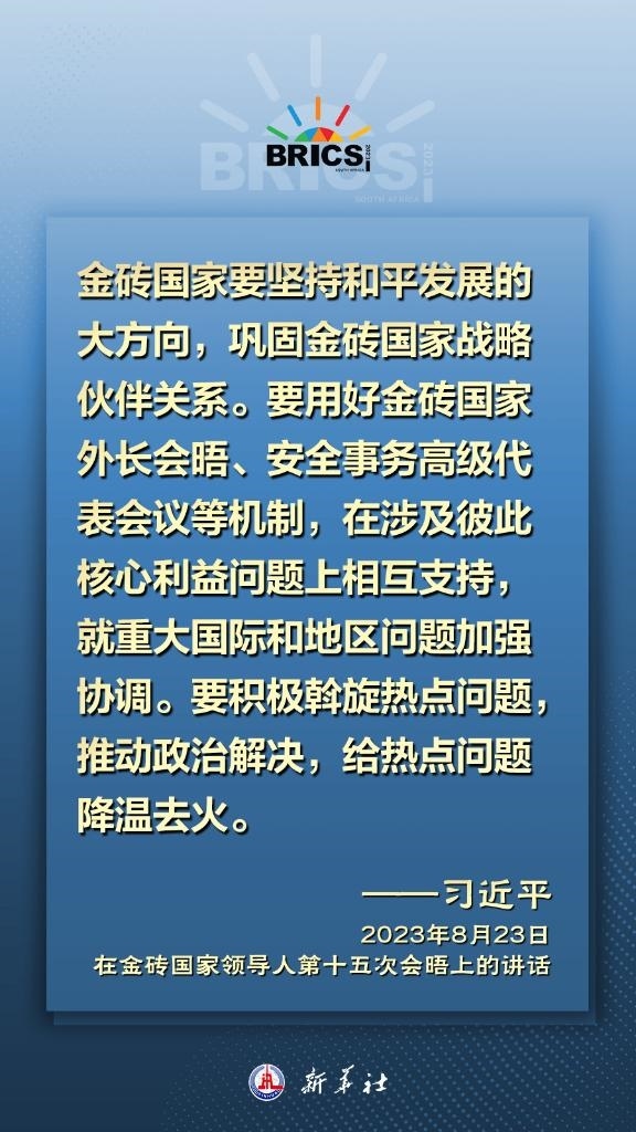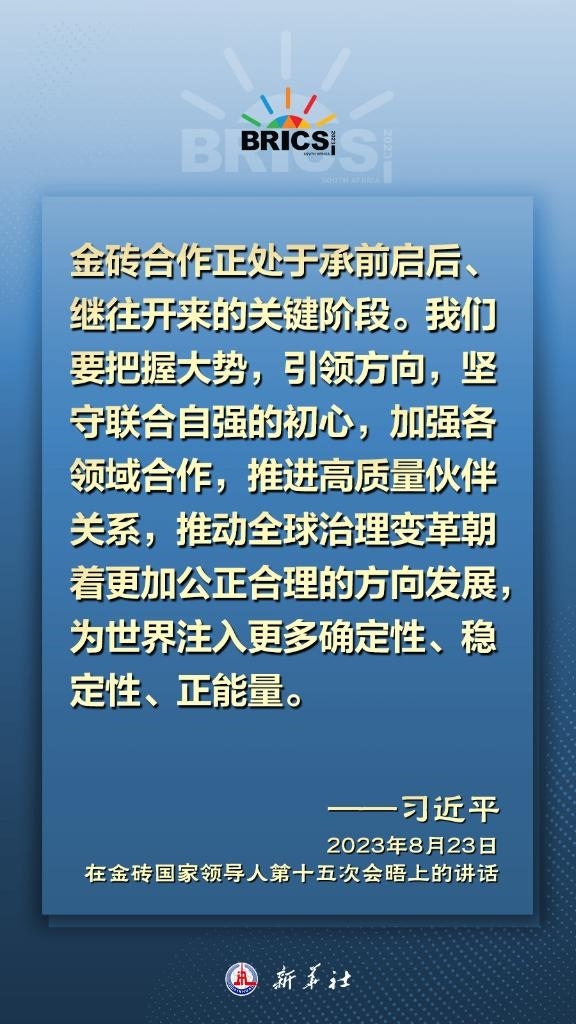國家主席習(xí)近平23日在南非約翰內(nèi)斯堡舉行的金磚國家領(lǐng)導(dǎo)人第十五次會(huì)晤上發(fā)表講話指出,金磚合作正處于承前啟后、繼往開來的關(guān)鍵階段。我們要把握大勢,引領(lǐng)方向,堅(jiān)守聯(lián)合自強(qiáng)的初心,加強(qiáng)各領(lǐng)域合作,推進(jìn)高質(zhì)量伙伴關(guān)系,推動(dòng)全球治理變革朝著更加公正合理的方向發(fā)展,為世界注入更多確定性、穩(wěn)定性、正能量。