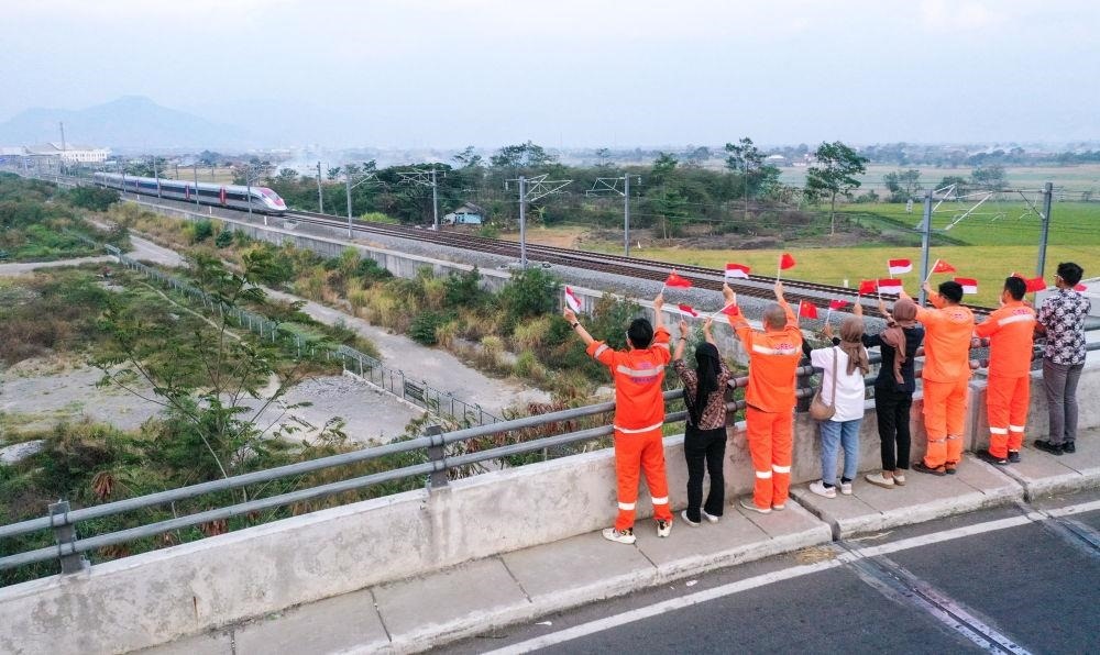 △2023年10月17日,在印度尼西亞萬隆一座天橋上,雅萬高鐵中國建設者和印尼籍員工揮舞著中國和印尼兩國國旗,向遠處駛來的一列雅萬高鐵高速動車組列車歡呼。