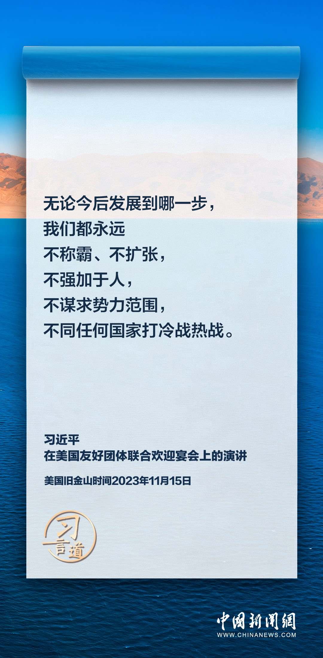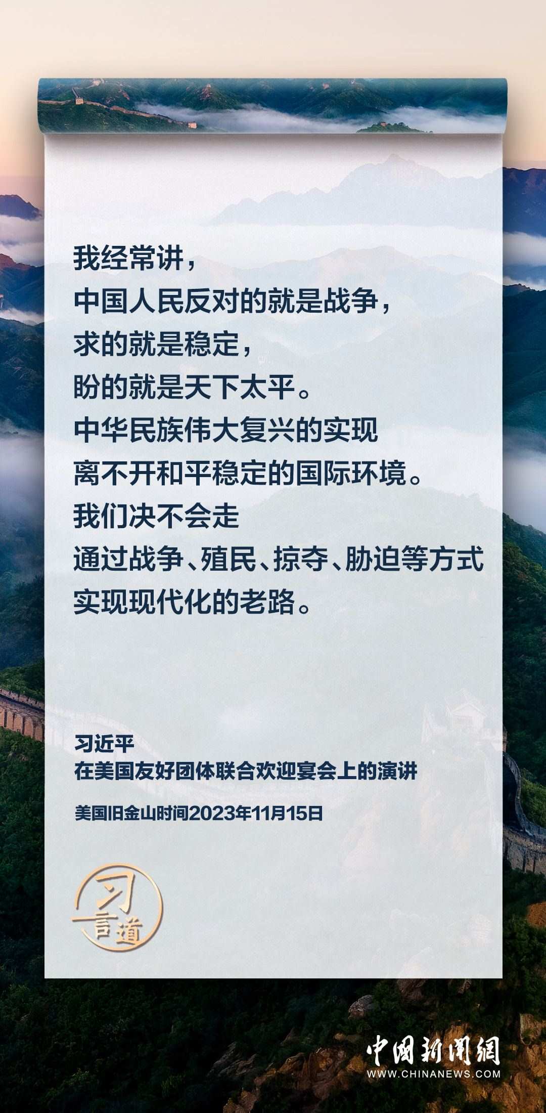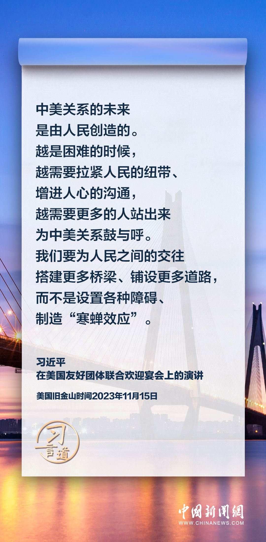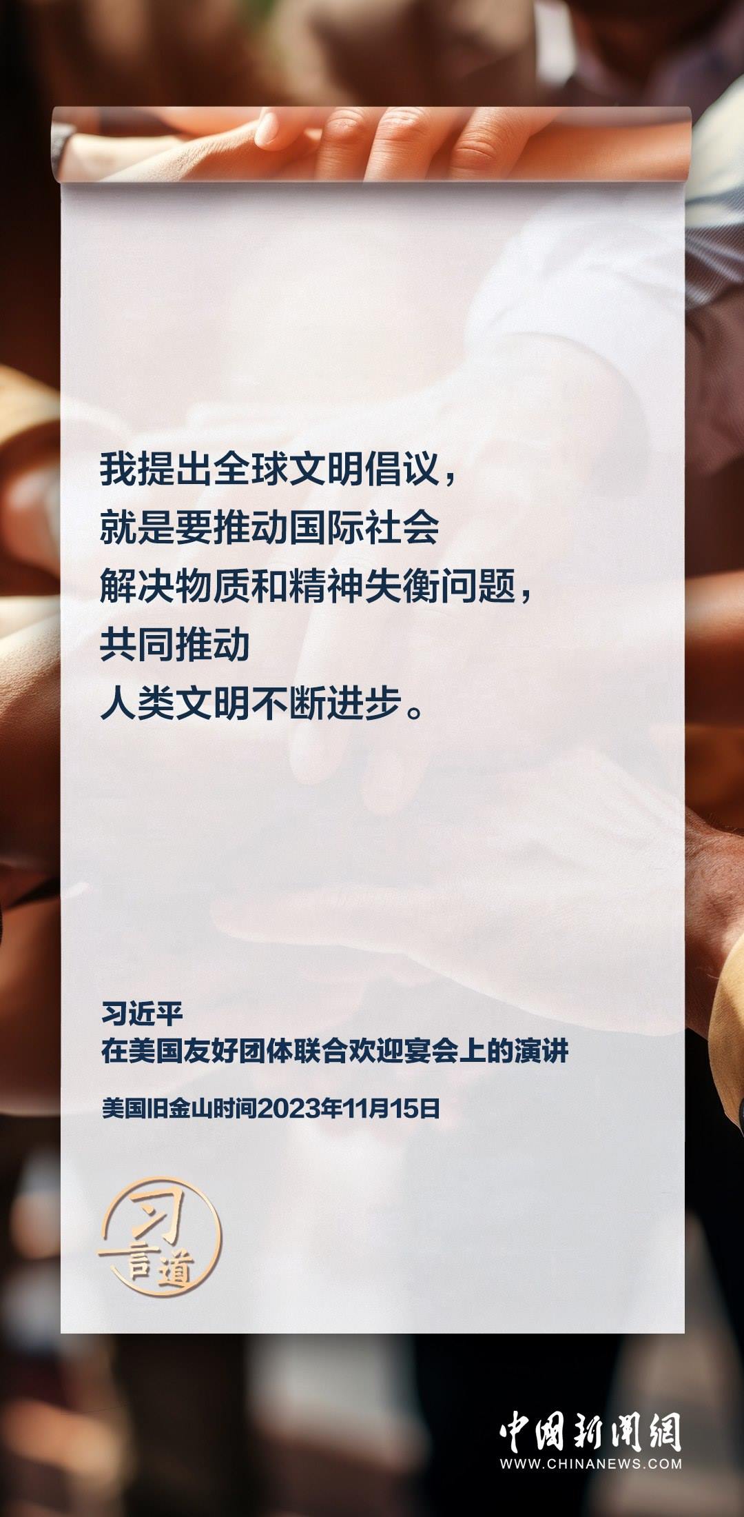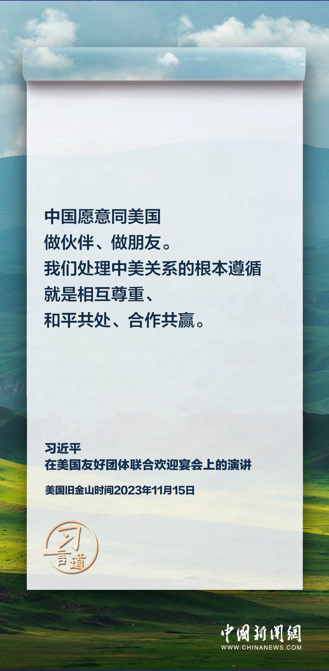當(dāng)?shù)貢r(shí)間11月15日,中國(guó)國(guó)家主席習(xí)近平在美國(guó)舊金山出席美國(guó)友好團(tuán)體聯(lián)合歡迎宴會(huì)并發(fā)表演講。習(xí)近平在演講中從“我”和“我們”說(shuō)起,提出中國(guó)主張、表明中國(guó)立場(chǎng)、展現(xiàn)大國(guó)擔(dān)當(dāng),話(huà)語(yǔ)擲地有聲。