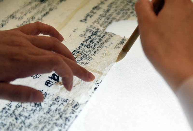 2022年5月17日,在安徽博物院文物科技保護(hù)中心紙質(zhì)文物修復(fù)室,工作人員對(duì)古籍文物進(jìn)行補(bǔ)全。
