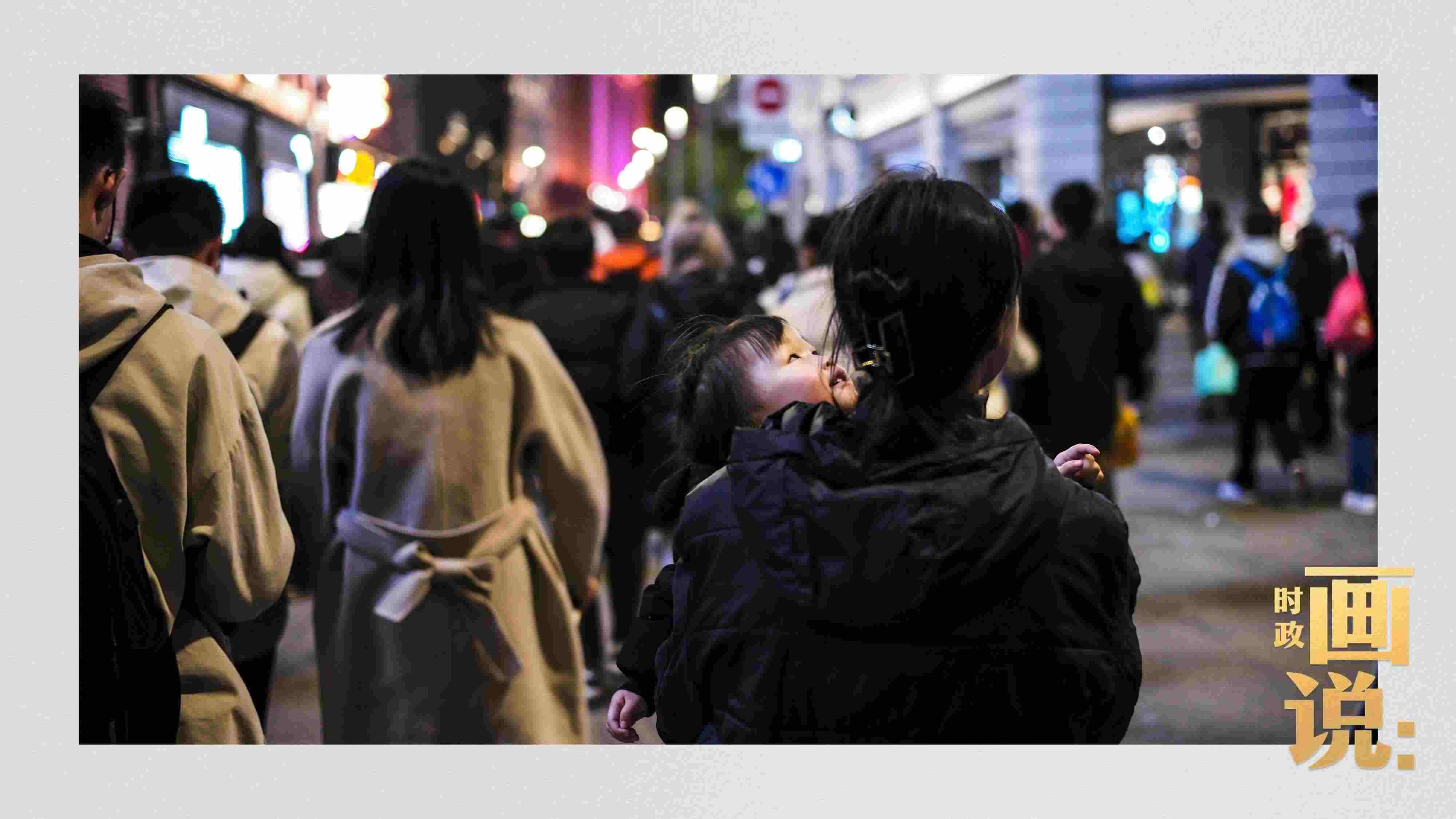 △母親懷抱中的小女孩仰望燈火璀璨的高樓大廈。南京路步行街,上海。