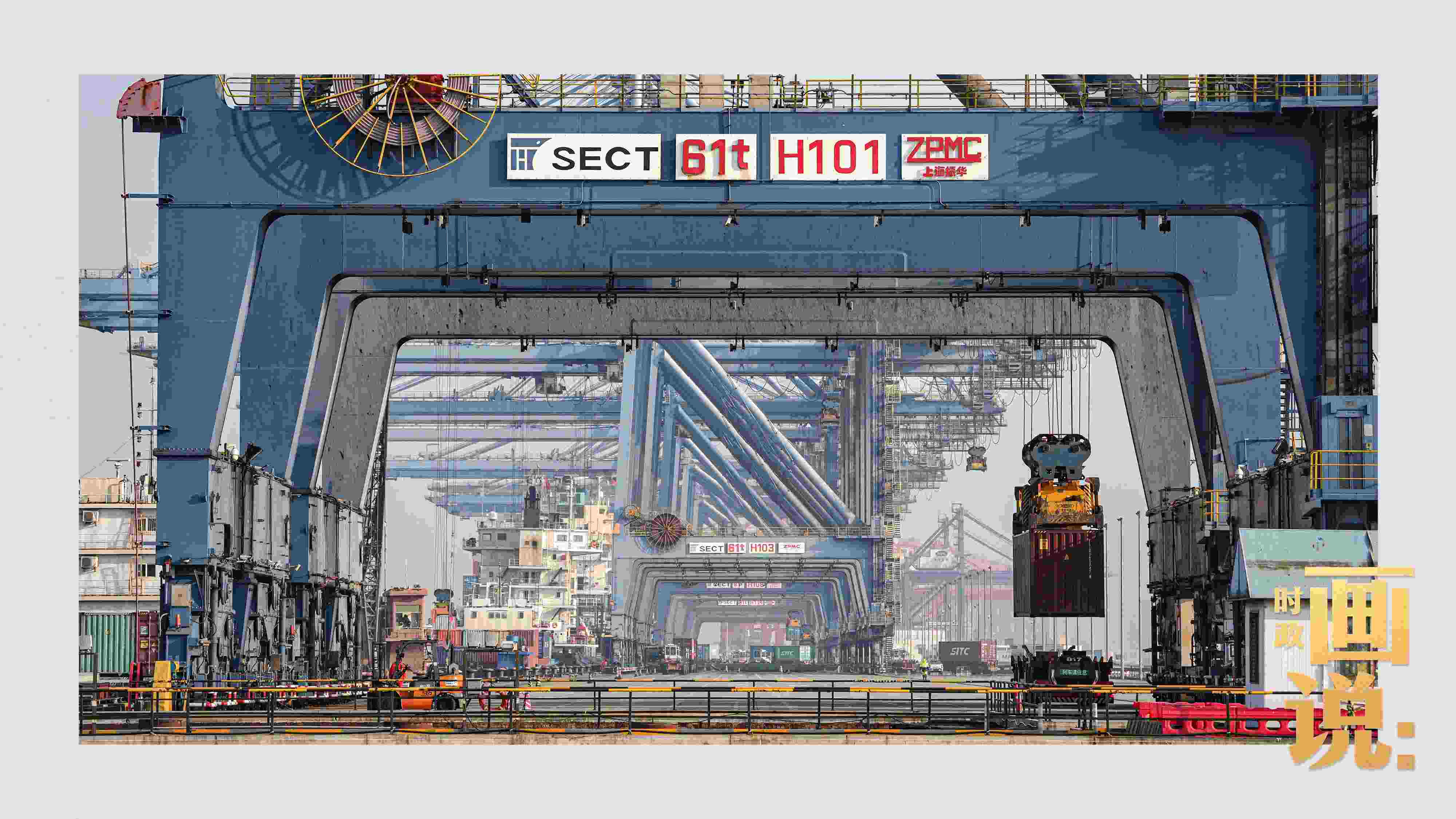 △上港集箱外高橋碼頭,巨型塔吊正在吊裝集裝箱貨柜。浦東,上海。