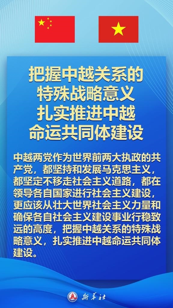 兩位總書記都認(rèn)為,中越作為友好近鄰,理想相同,理念相通。作為好鄰居、好伙伴、好兄弟、好同志,中越構(gòu)建具有戰(zhàn)略意義的命運(yùn)共同體具有天時(shí)、地利、人和的獨(dú)特優(yōu)勢(shì)。雙方應(yīng)該繼承老一輩領(lǐng)導(dǎo)人締結(jié)的傳統(tǒng)友誼,共同努力構(gòu)建命運(yùn)共同體,走好各自的現(xiàn)代化道路,實(shí)現(xiàn)互利共贏、美美與共,造福兩國人民,也為地區(qū)和平與繁榮作出積極貢獻(xiàn)。