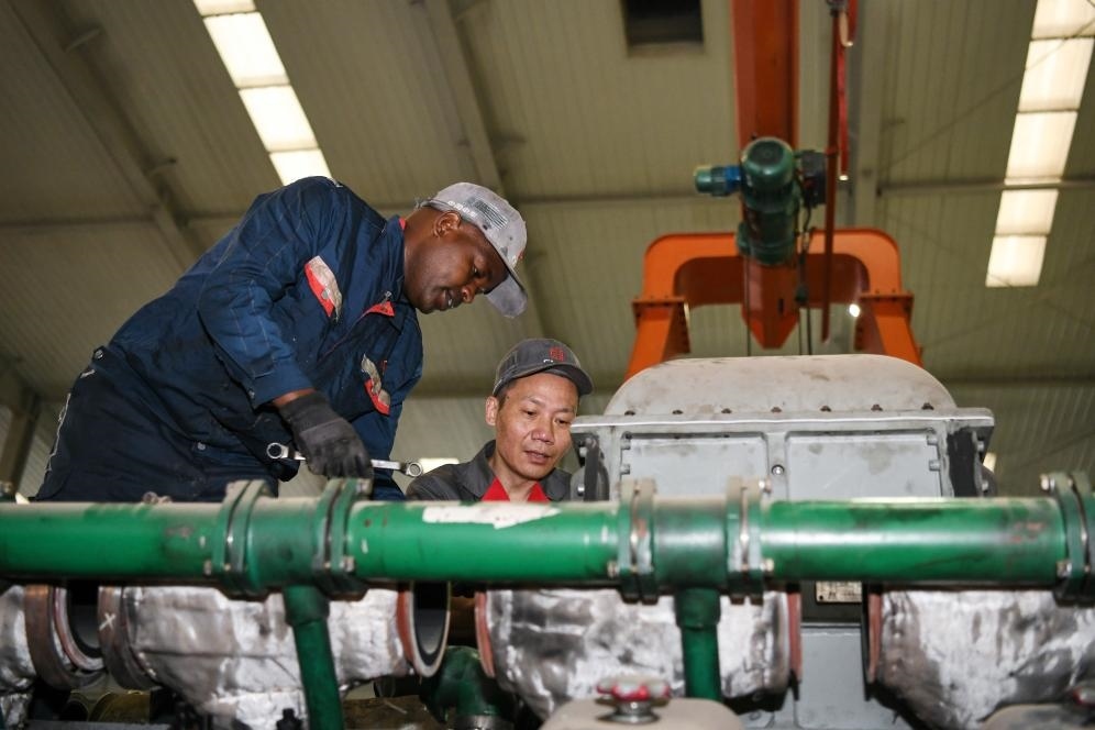 2023年7月4日,中國中車駐肯員工和肯方員工在肯尼亞內(nèi)羅畢的蒙內(nèi)鐵路機(jī)車維保車間工作。
