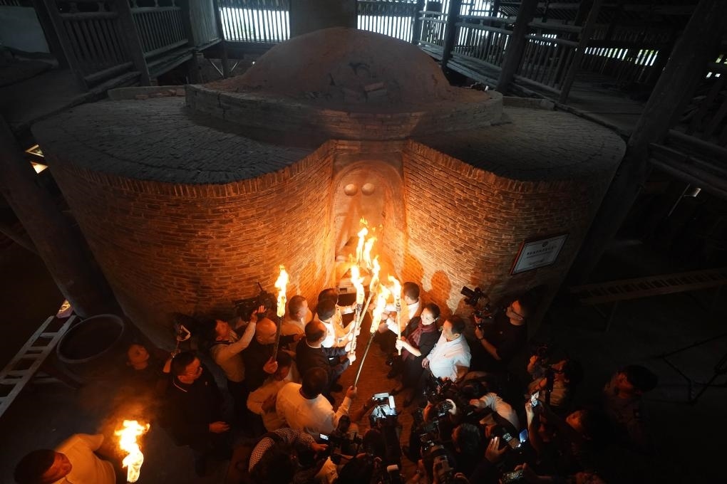 2023年10月19日,嘉賓與把樁師傅一起對(duì)葫蘆窯進(jìn)行復(fù)燒點(diǎn)火。當(dāng)日,作為2023中國(guó)景德鎮(zhèn)國(guó)際陶瓷博覽會(huì)的活動(dòng)之一,景德鎮(zhèn)古窯民俗博覽區(qū)對(duì)重建的明代葫蘆窯進(jìn)行點(diǎn)火復(fù)燒。同時(shí),景德鎮(zhèn)歷代瓷窯活態(tài)傳承紀(jì)實(shí)館開(kāi)館。新華社記者 周密 攝