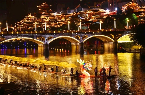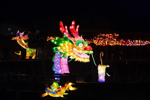 同樣迎來2024年龍年新春燈會的,還有湖北省恩施州宣恩縣城,這里的龍造型燈組格外亮眼,特別是其中一條非常壯觀的“貢水游龍”,龍身由30多只竹筏串聯(lián)而成,總長度達(dá)到200多米。游客還可以登上龍船觀燈展、賞夜色。隨著金色的巨龍在碧水中蜿蜒游動,也傳遞著吉祥的寓意。