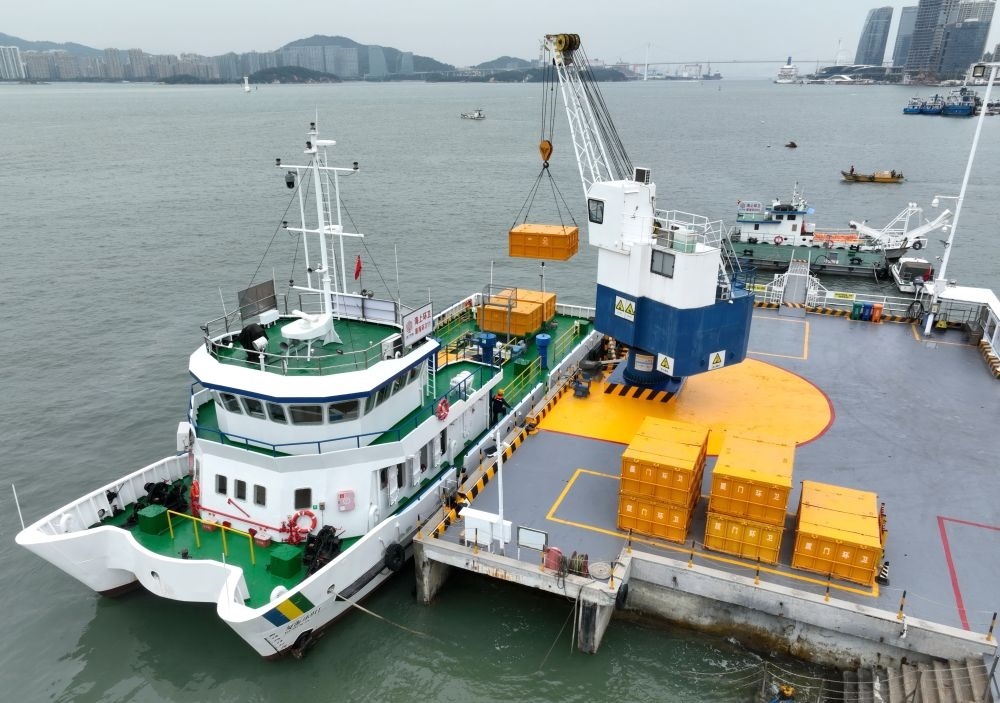 2024年1月25日,工作人員在廈門西堤海上環(huán)衛(wèi)碼頭吊運(yùn)海漂垃圾(無人機(jī)照片)。新華社記者 林善傳 攝