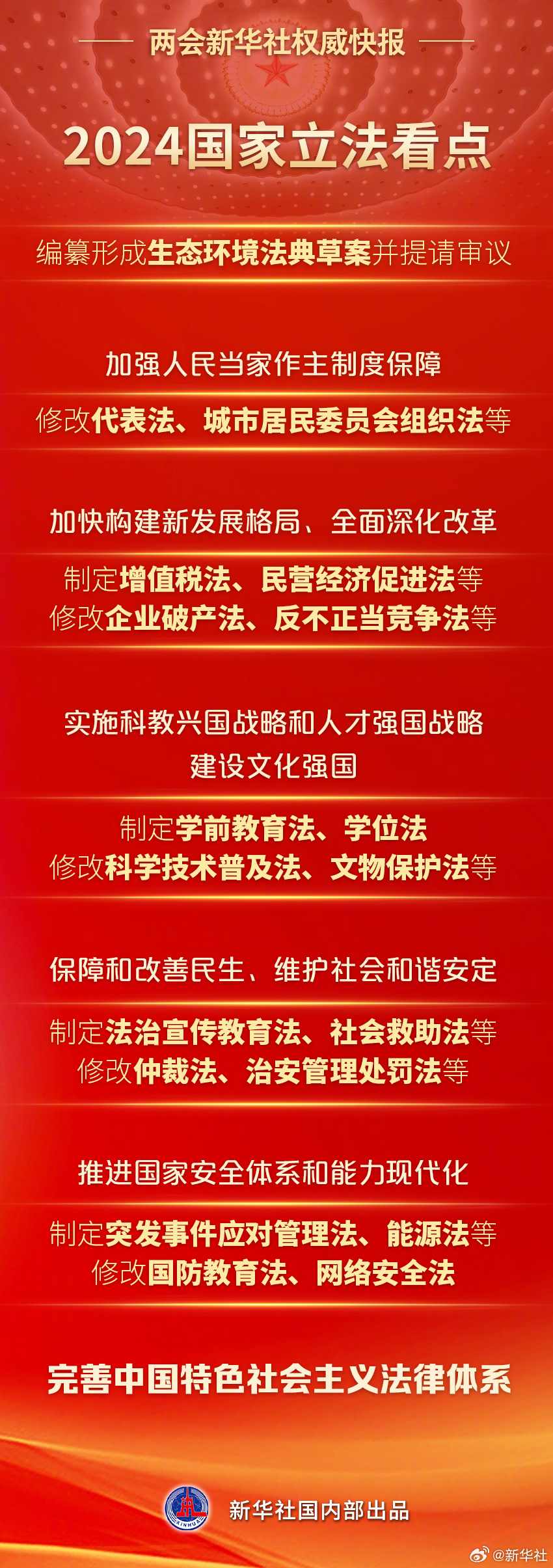 8日提請十四屆全國人大二次會議審議的全國人大常委會工作報告提出,2024年,要認真落實常委會立法規(guī)劃,完善中國特色社會主義法律體系:制定民營經(jīng)濟促進法、學前教育法、社會救助法等,修改城市居民委員會組織法、文物保護法、網(wǎng)絡安全法等。