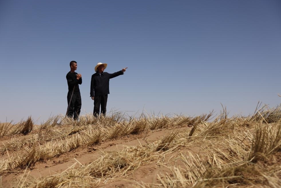 4月10日,在古浪縣八步沙林場麻黃塘沙區(qū),郭璽(左)和郭萬剛在交流。新華社記者 方欣 攝