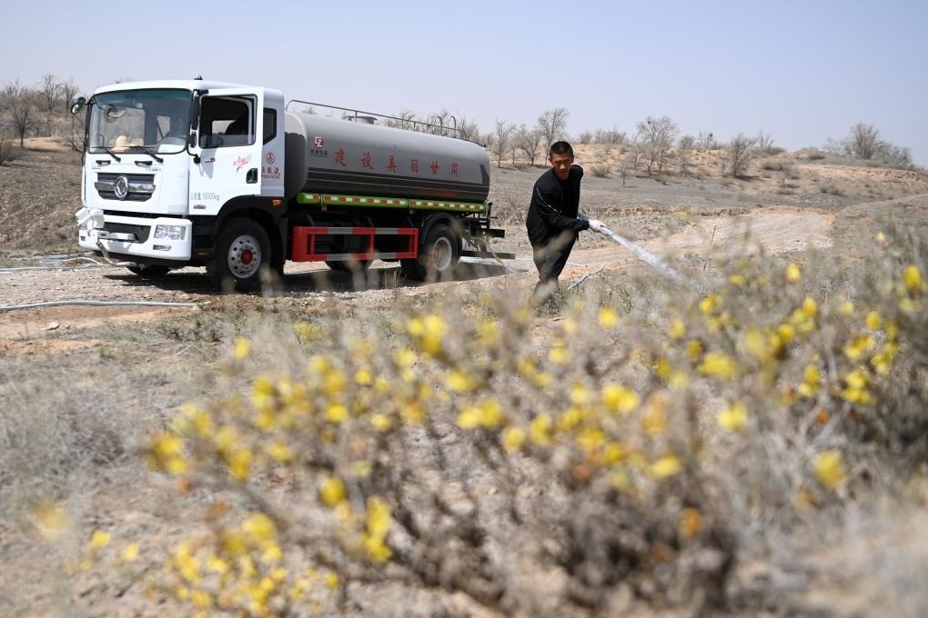 4月11日,在古浪縣八步沙林場眼窩子沙治沙點,郭璽澆灌植被。新華社記者 范培珅 攝