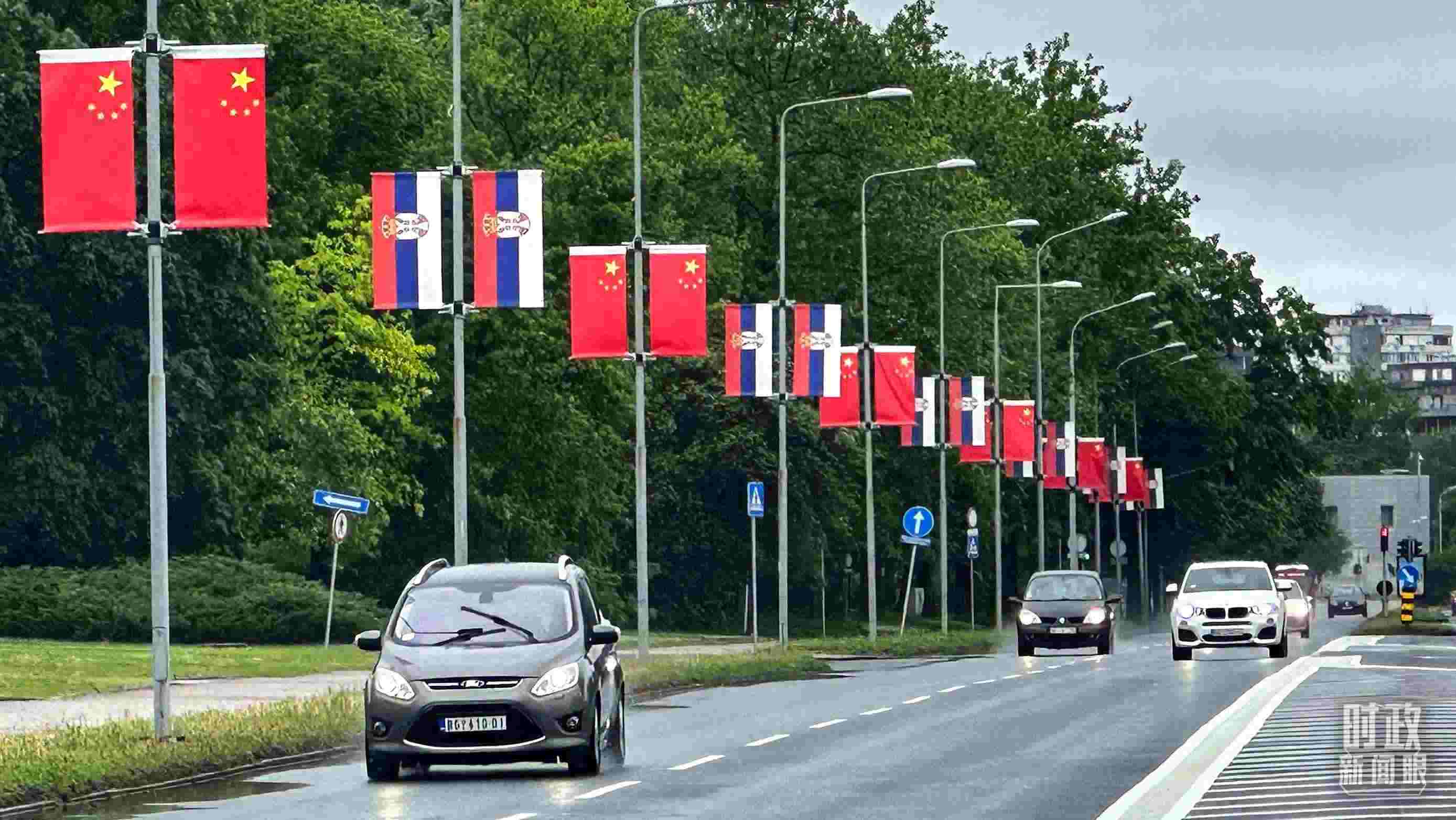 △貝爾格萊德的主要街道掛滿五星紅旗,隨風飄揚。(總臺央視記者范一鳴拍攝)