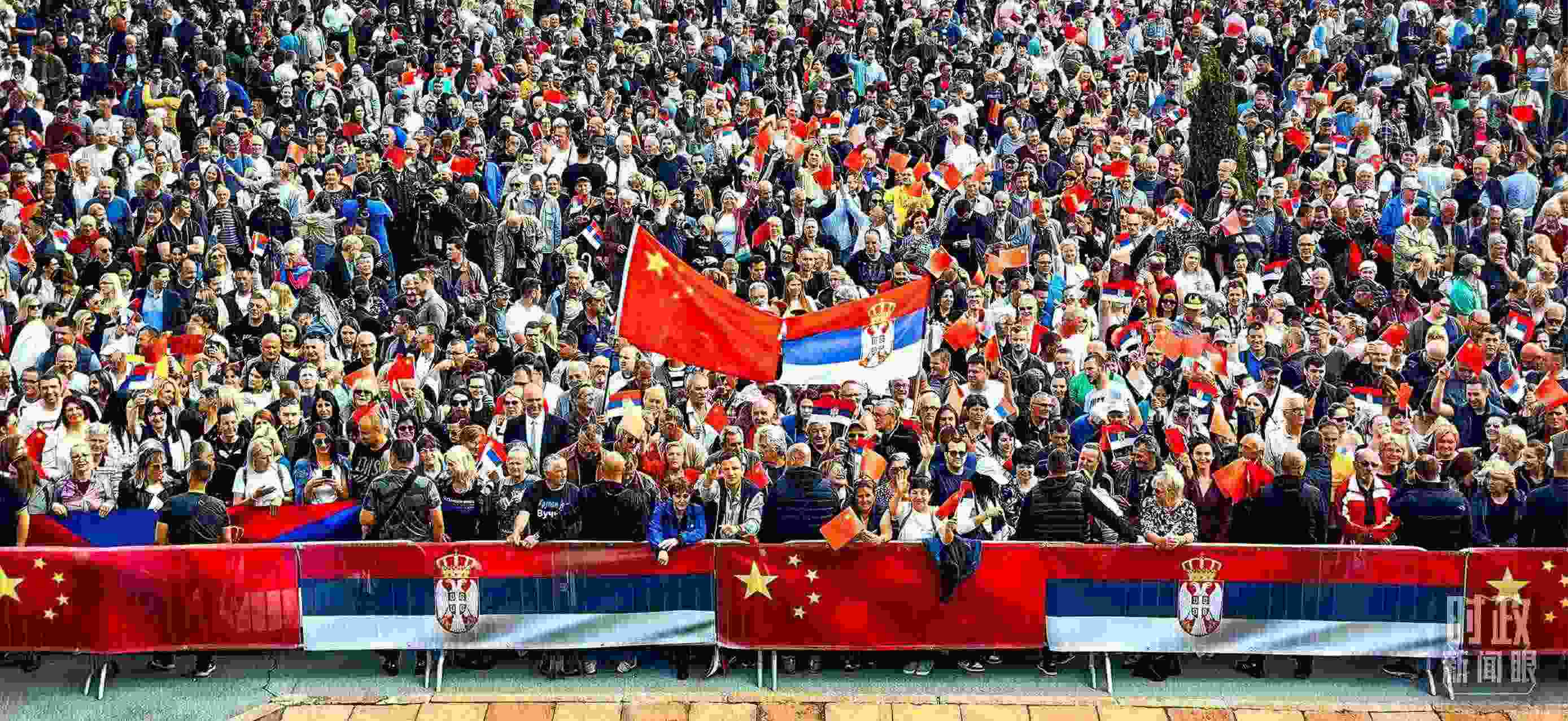 △塞爾維亞大廈廣場上,一萬五千名塞爾維亞民眾揮舞中塞兩國國旗,熱烈歡迎習主席到訪。(總臺央視記者段德文拍攝)