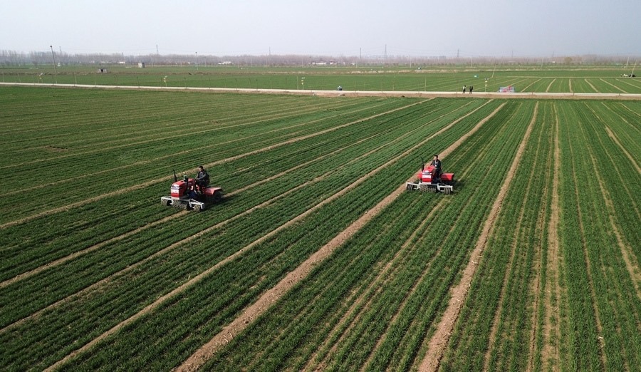山東省汶上縣,農(nóng)民駕駛農(nóng)機(jī)在高標(biāo)準(zhǔn)農(nóng)田里進(jìn)行小麥春季管護(hù)作業(yè)(2024年3月13日攝,無人機(jī)照片)。新華社記者 徐速繪 攝