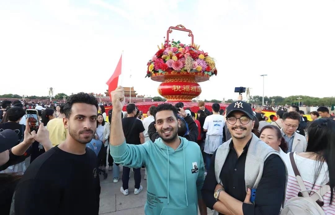 △2023年10月1日,三位來自阿爾及利亞的游客在北京天安門廣場“祝福祖國”巨型花籃前留影。