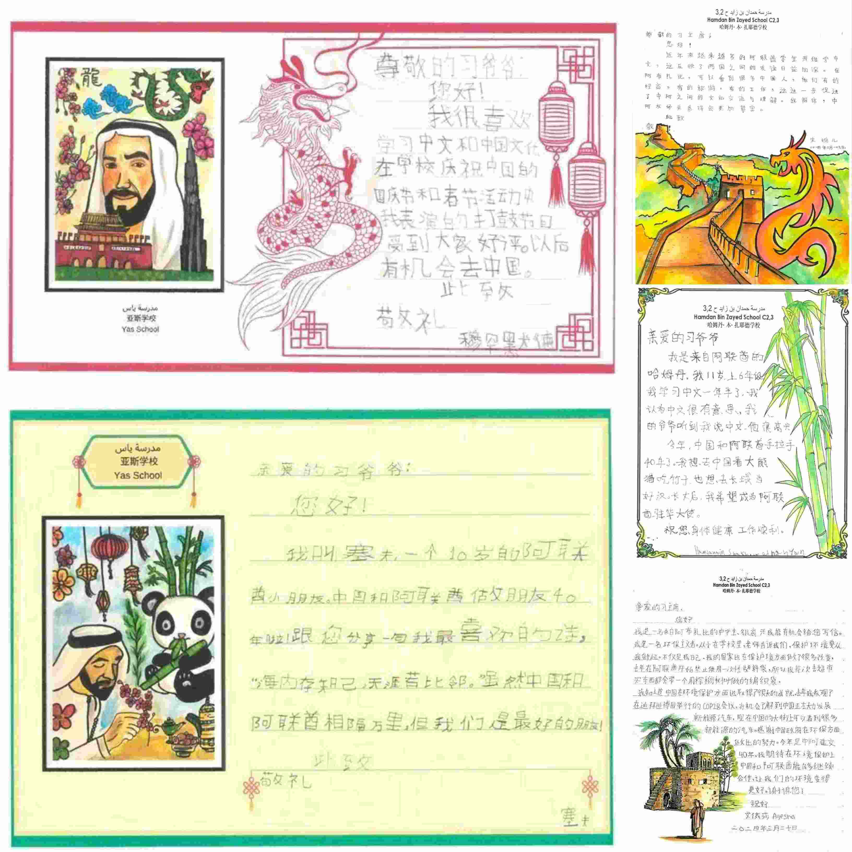 “我讀了你們每個人的信,從字里行間、畫里畫外感受到了大家對中國文化的熱愛,對兩國友好的期盼。”近日,習(xí)近平主席在給他們的復(fù)信中說,“5年前,我同穆罕默德總統(tǒng)共同啟動阿聯(lián)酋中文教學(xué)‘百校項目’,如今看到‘學(xué)中文’在阿聯(lián)酋已經(jīng)成為一種新風(fēng)尚,培養(yǎng)了一批像你們這樣的中阿交流小使者,我很欣慰。”