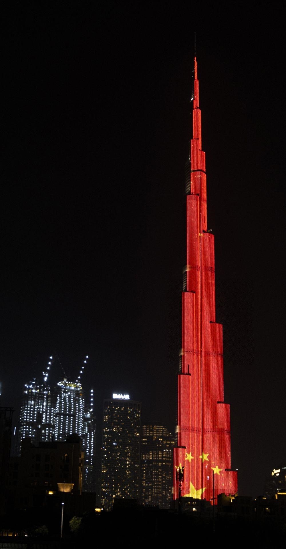 △當(dāng)?shù)貢r間2020年2月2日,在阿聯(lián)酋迪拜,當(dāng)?shù)氐貥?biāo)建筑物哈利法塔點亮中國國旗圖案,為中國抗擊新冠肺炎疫情加油。