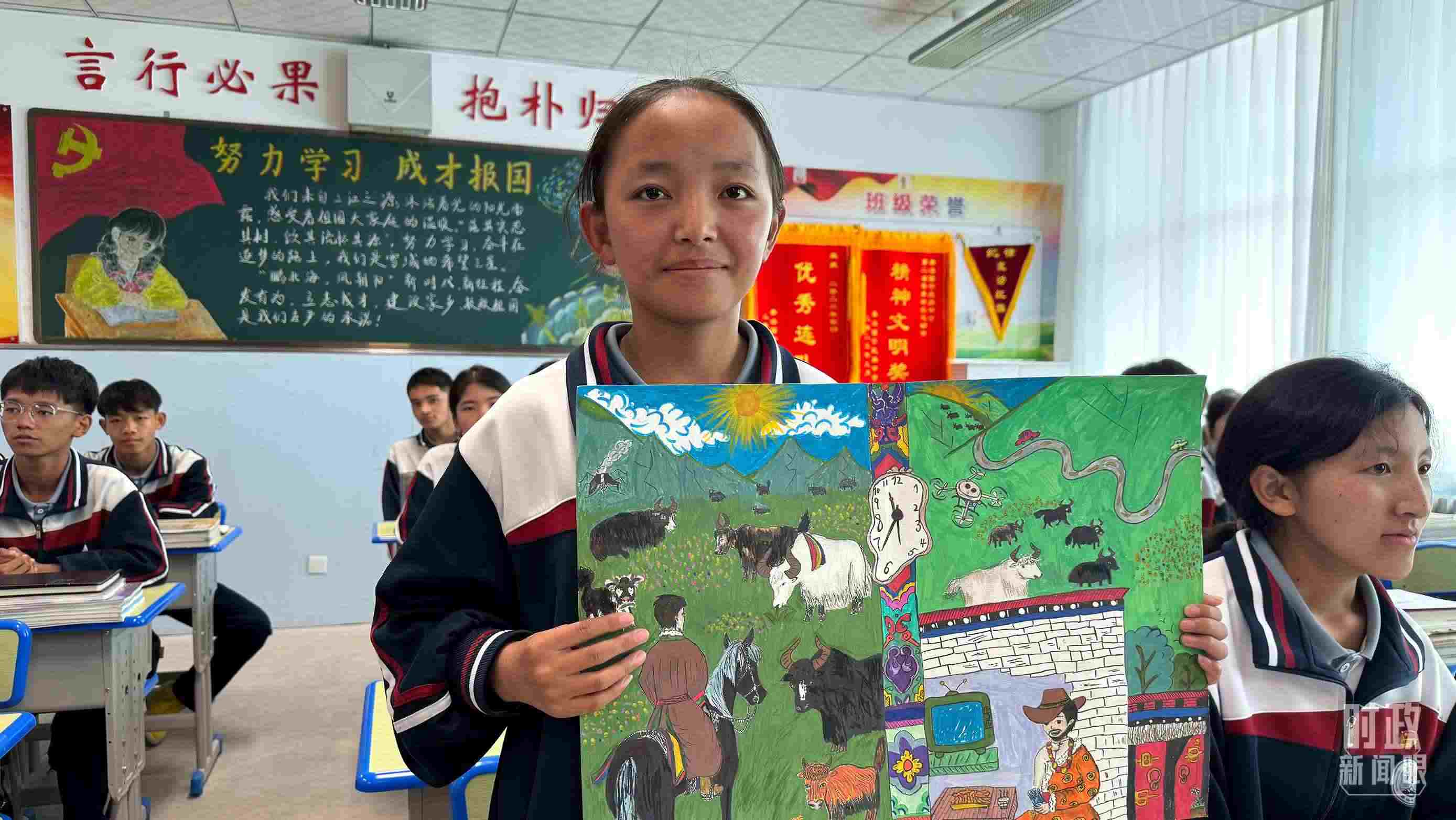 △果洛西寧民族中學(xué)高一(1)班的“新時(shí)代、新家鄉(xiāng)”主題思政課。(總臺(tái)央視記者許永松、國(guó)廣記者李晉拍攝)