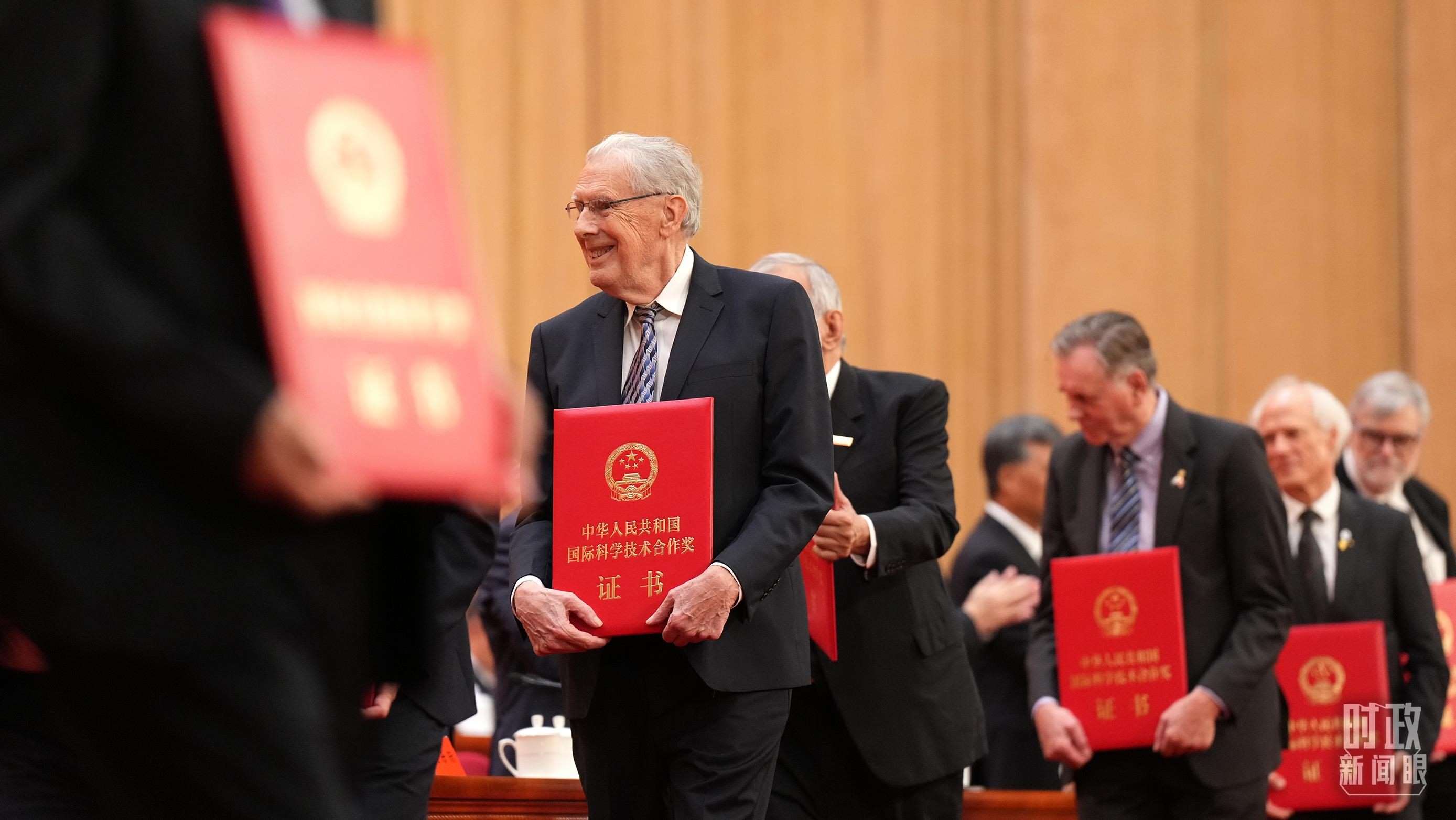 △獲獎(jiǎng)的外籍科技工作者,獎(jiǎng)?wù)碌谋趁婵逃蝎@獎(jiǎng)?wù)咝彰#偱_(tái)國(guó)廣記者李晉、央視記者姚瑤拍攝)