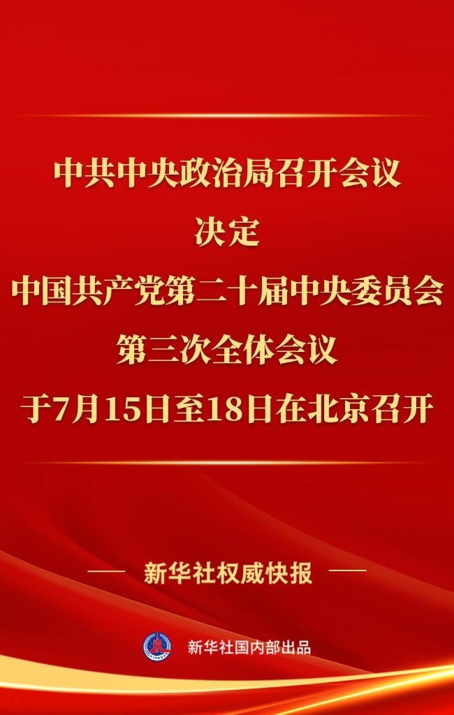 中共中央政治局6月27日召開(kāi)會(huì)議,研究進(jìn)一步全面深化改革、推進(jìn)中國(guó)式現(xiàn)代化問(wèn)題。中共中央總書記習(xí)近平主持會(huì)議。會(huì)議決定,中國(guó)共產(chǎn)黨第二十屆中央委員會(huì)第三次全體會(huì)議于7月15日至18日在北京召開(kāi)。
