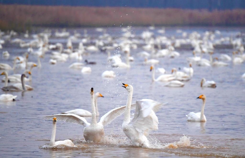 白天鵝在河南三門(mén)峽黃河濕地嬉戲。新華社記者 郝源 攝