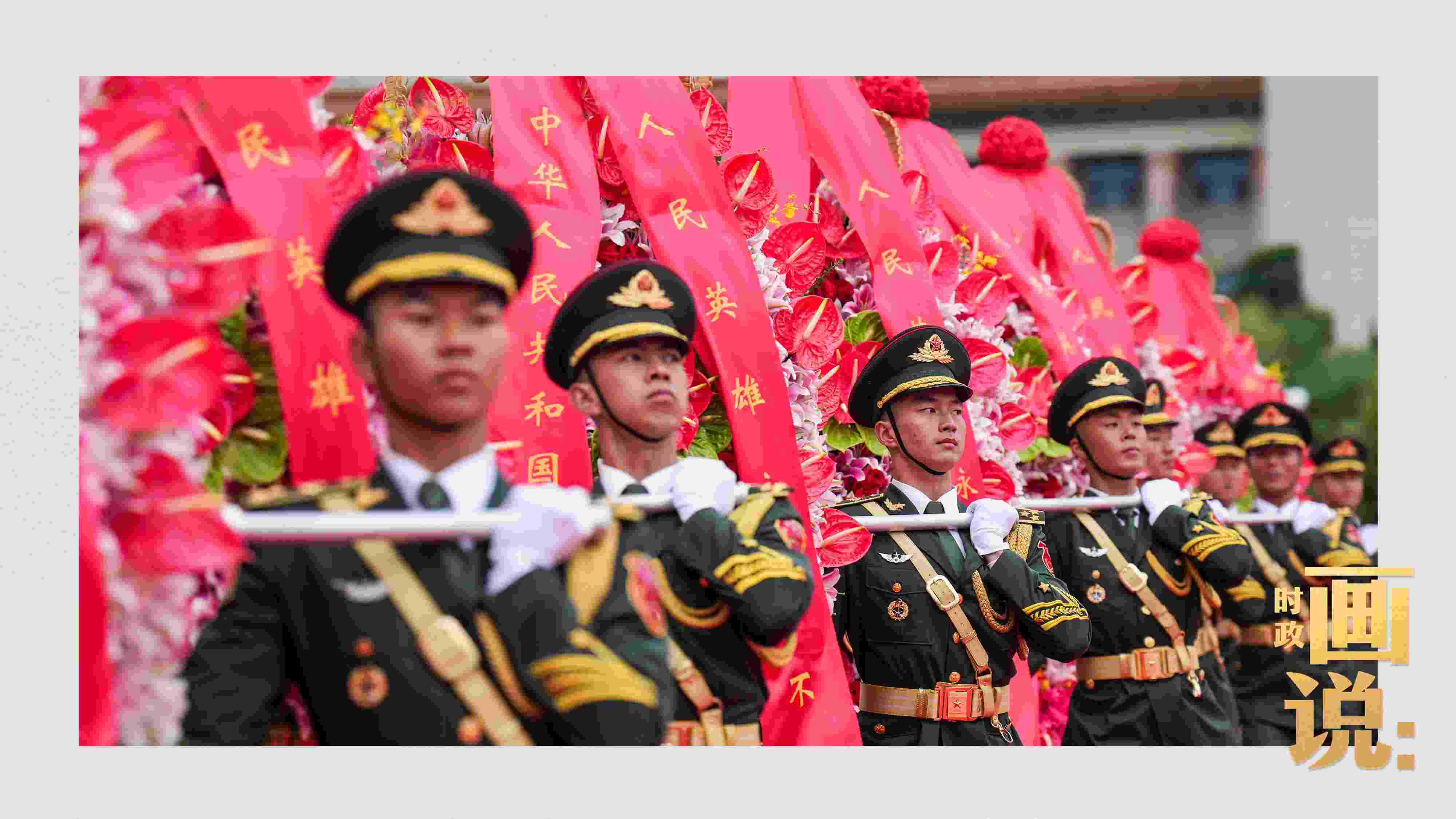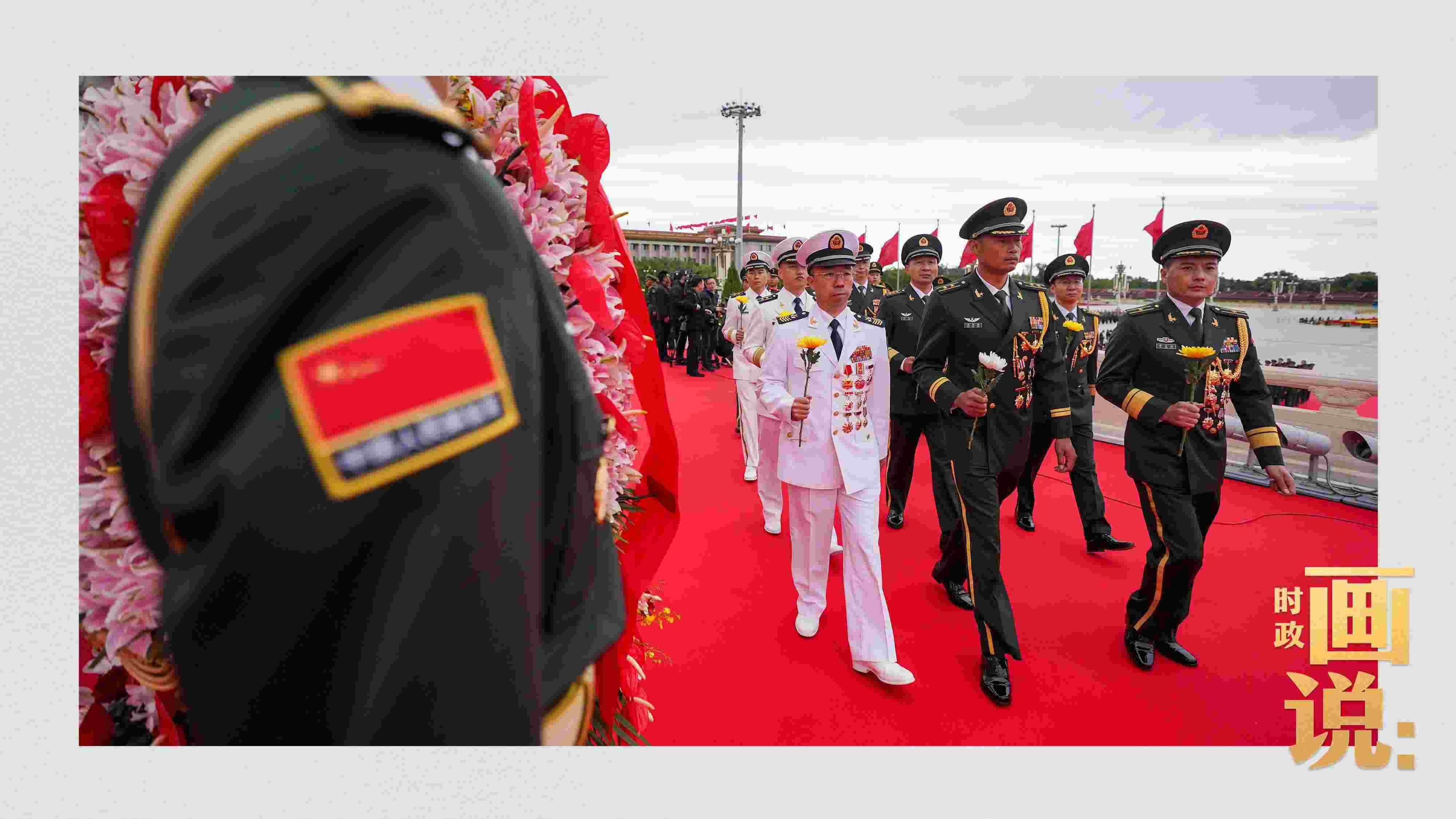△禮兵抬起花籃,緩步走向人民英雄紀(jì)念碑。