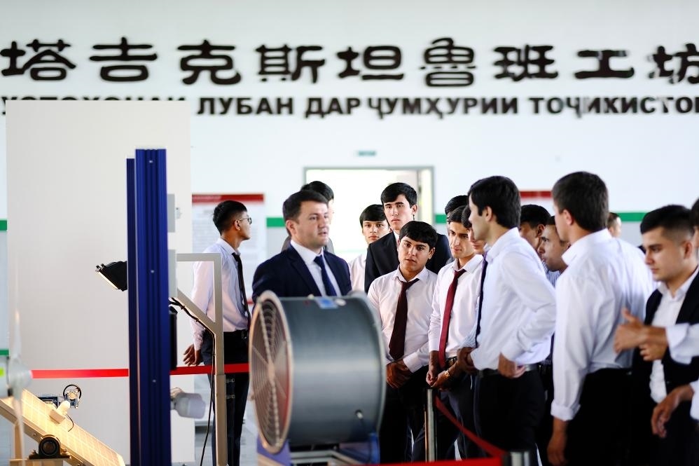 6月14日,在塔吉克斯坦首都杜尚別,學生們在魯班工坊內(nèi)聽老師講解。