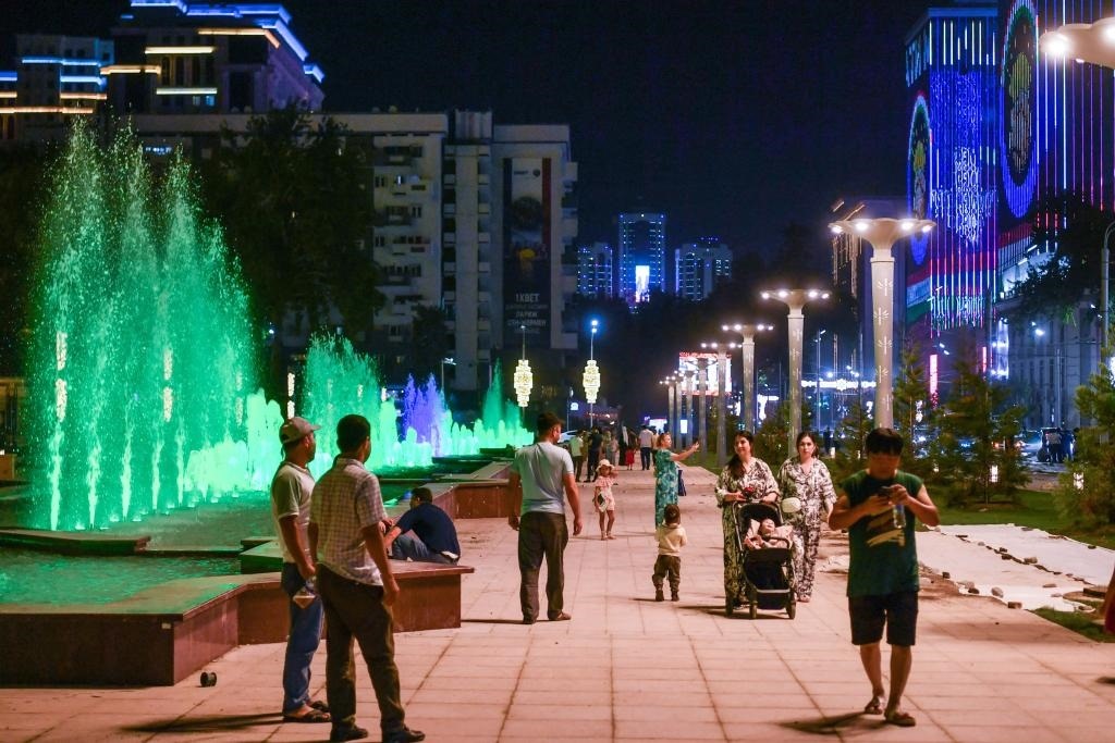 6月25日,在塔吉克斯坦首都杜尚別街頭,入夜后當?shù)鼐用駧е⒆酉罴{涼。