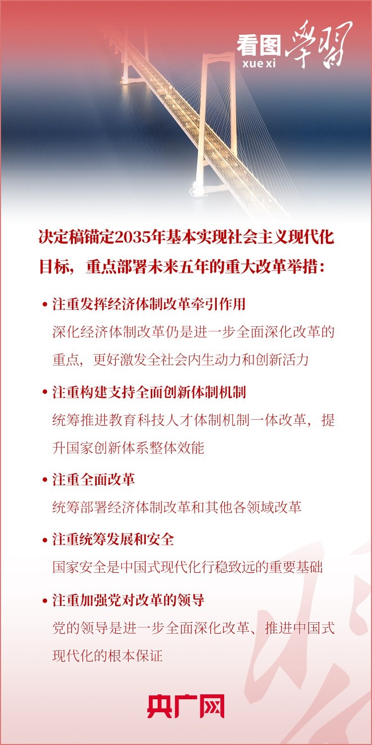 從征求和確定全會議題到起草文件、深入調(diào)查研究、廣泛征求意見、開展專題論證、反復(fù)討論修改,習(xí)近平總書記指出,決定稿錨定2035年基本實現(xiàn)社會主義現(xiàn)代化目標,重點部署未來五年的重大改革舉措?!拔鍌€注重”成為《決定》內(nèi)容擺布鮮明特點。一起來學(xué)習(xí)!