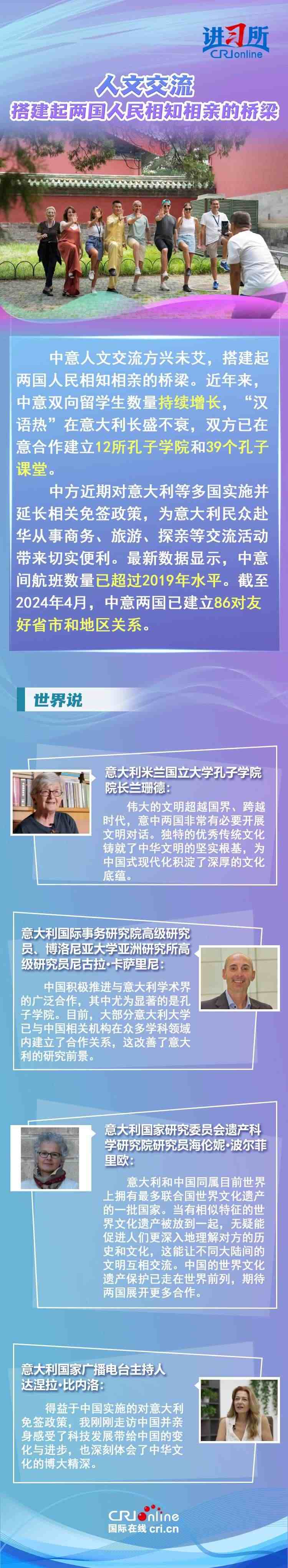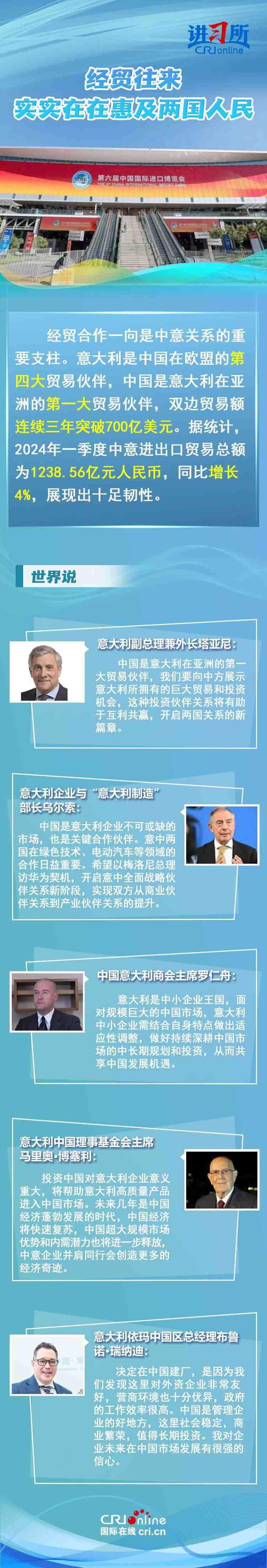 梅洛尼表示,中國對意大利而言是一個極為重要的經(jīng)貿(mào)和文化合作伙伴。意大利各界人士認(rèn)為,中意并肩同行會創(chuàng)造更多的經(jīng)濟(jì)奇跡,同時兩國非常有必要開展文明對話,期待未來兩國展開更多領(lǐng)域合作,開啟全面戰(zhàn)略伙伴關(guān)系新階段。