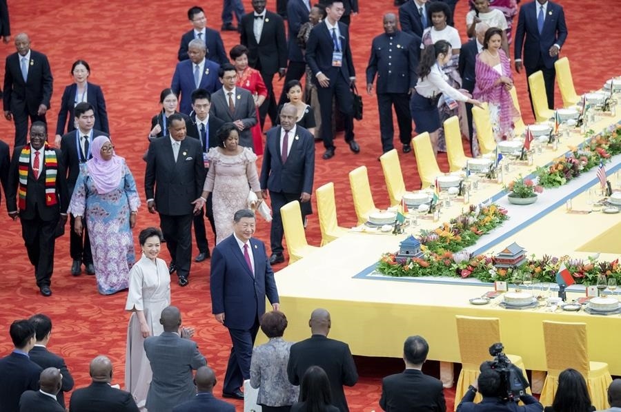 △2024年9月5日,習(xí)近平主席在北京人民大會堂出席中非合作論壇北京峰會開幕式并發(fā)表主旨講話。這是習(xí)近平主席同外方領(lǐng)導(dǎo)人共同步入會場。