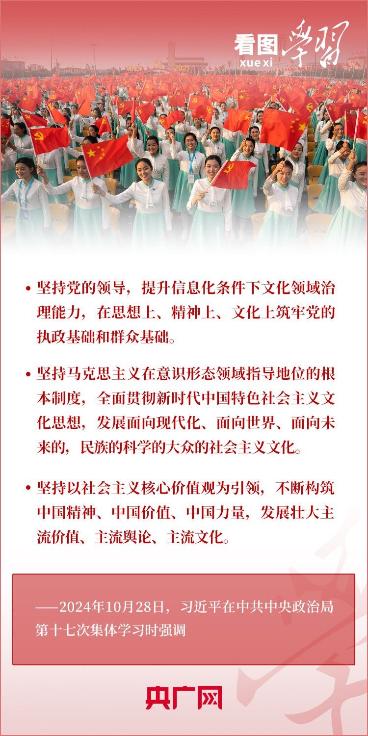 建設(shè)文化強(qiáng)國是全黨全社會(huì)的共同任務(wù)。10月28日,中共中央政治局就建設(shè)文化強(qiáng)國進(jìn)行第十七次集體學(xué)習(xí)。習(xí)近平總書記在聽取講解和討論后發(fā)表重要講話,就錨定2035年建成文化強(qiáng)國戰(zhàn)略目標(biāo)作出最新部署,強(qiáng)調(diào)要“不斷發(fā)展具有強(qiáng)大思想引領(lǐng)力、精神凝聚力、價(jià)值感召力、國際影響力的新時(shí)代中國特色社會(huì)主義文化,不斷增強(qiáng)人民精神力量,筑牢強(qiáng)國建設(shè)、民族復(fù)興的文化根基?!币黄饋韺W(xué)習(xí)!