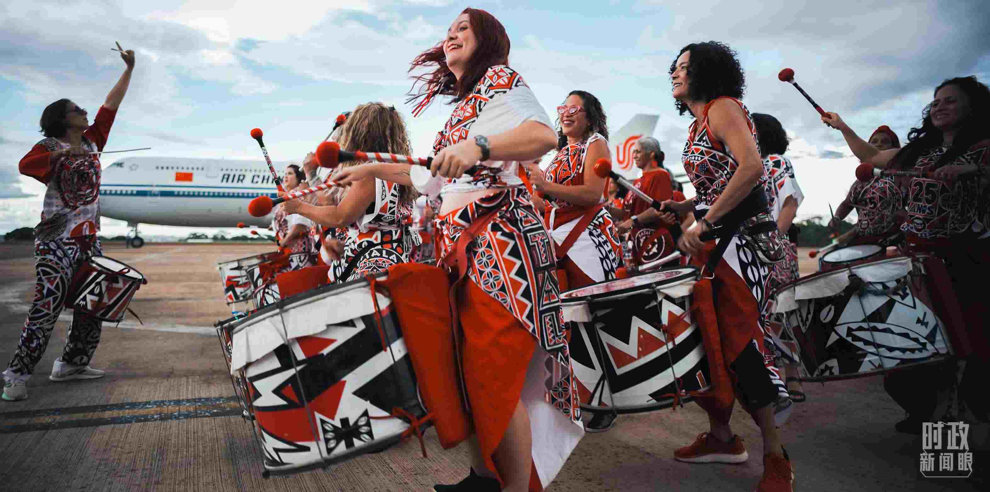 △習(xí)主席乘專機抵達(dá)巴西利亞,藝術(shù)家演奏特色鼓樂。(總臺央視記者彭漢明拍攝)