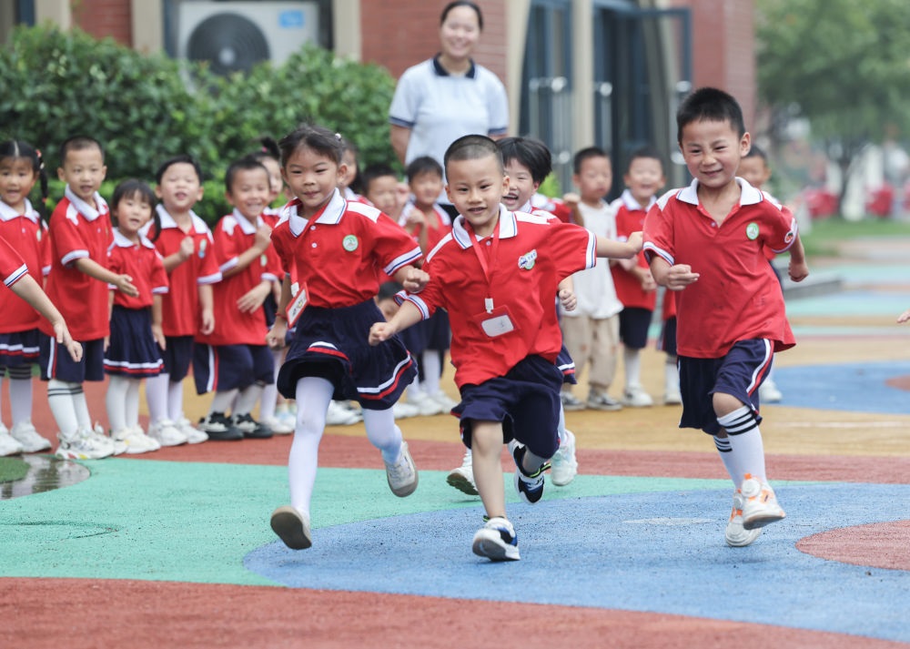 2024年9月26日,孩子們在浙江省湖州市長興縣開發(fā)區(qū)中心幼兒園參加趣味追逐游戲。新華社記者 徐昱 攝