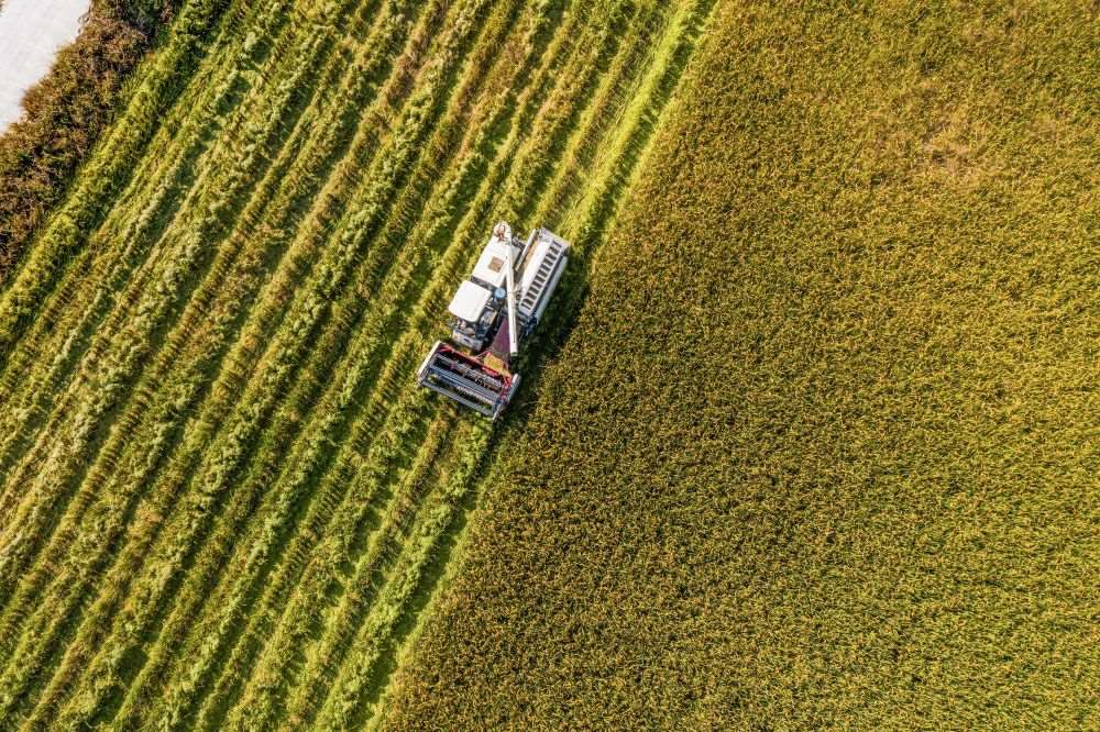 2024年10月25日,收割機在浙江省湖州市吳興區(qū)東林鎮(zhèn)保國村的稻田里作業(yè)(無人機照片)。新華社記者 徐昱 攝