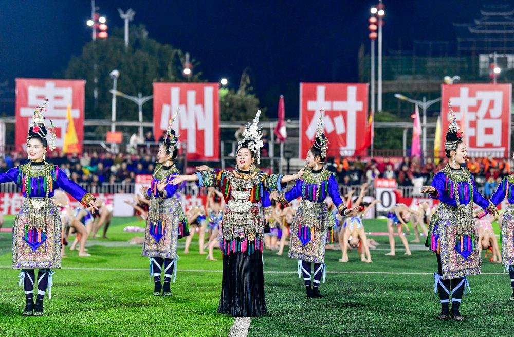 △2025年3月14日,2025年貴州“村超”40強交叉賽在榕江“村超”足球場舉行,演員在比賽間隙表演侗族大歌。
