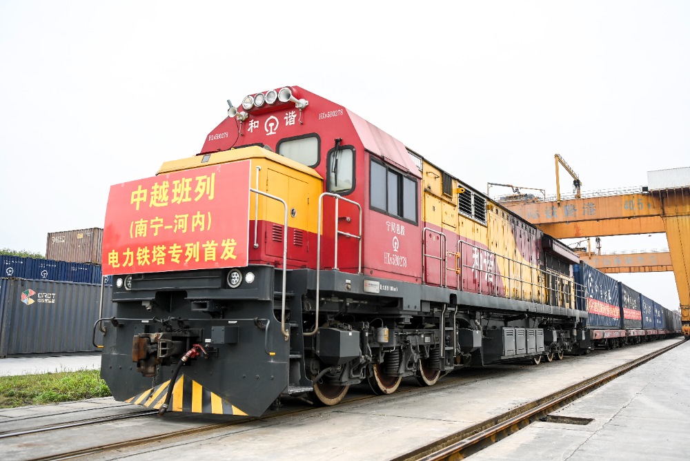 2024年3月8日,在廣西南寧國(guó)際鐵路港,電力鐵塔專(zhuān)列準(zhǔn)備發(fā)車(chē)。當(dāng)日,一列滿載340噸電力鐵塔的中越班列從南寧國(guó)際鐵路港開(kāi)出,發(fā)往越南河內(nèi)。新華社記者 曹祎銘 攝