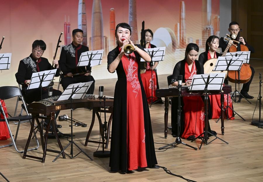 2023年11月24日,在馬來(lái)西亞雪蘭莪州的廈門(mén)大學(xué)馬來(lái)西亞分校,藝術(shù)家在音樂(lè)會(huì)上演奏?!敖z路粵韻——廣東民族音樂(lè)會(huì)”當(dāng)晚在廈門(mén)大學(xué)馬來(lái)西亞分校舉辦。新華社記者程一恒攝