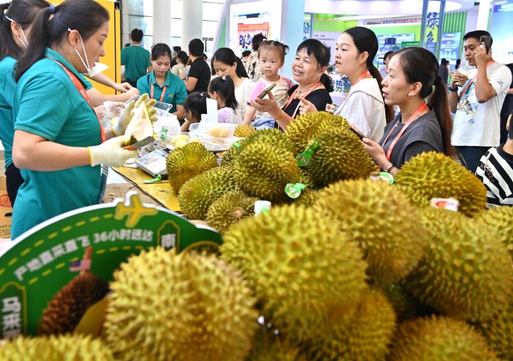 2024年9月28日,觀眾在中國(guó)-東盟博覽會(huì)上挑選馬來(lái)西亞榴蓮。新華社記者周華攝