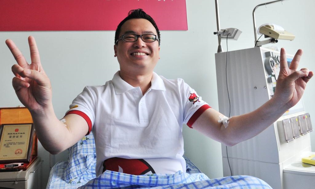 2012年4月17日,馬來(lái)西亞青年楊永康在造血干細(xì)胞采集結(jié)束后打出勝利的手勢(shì)。新華社記者岳月偉攝