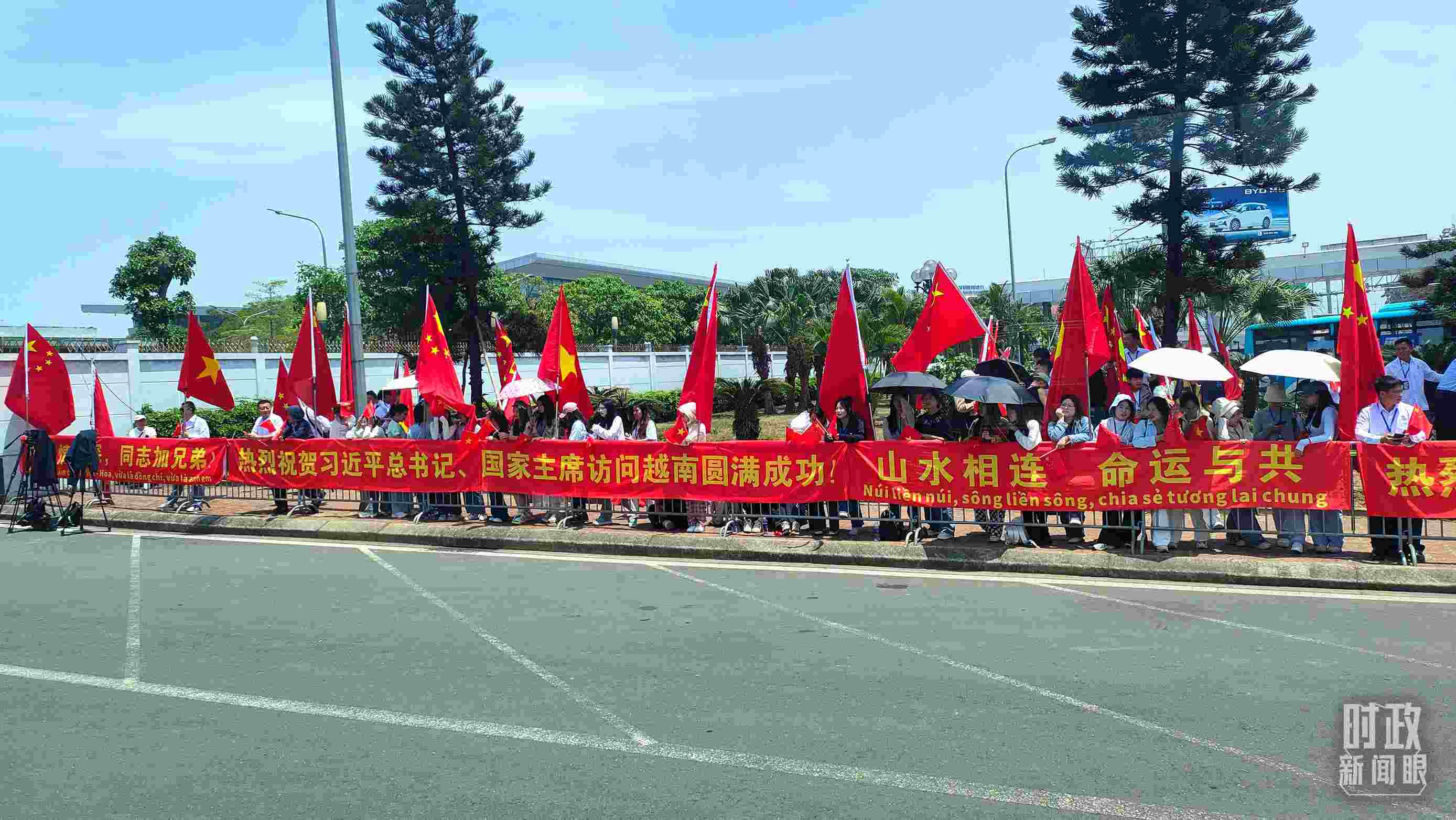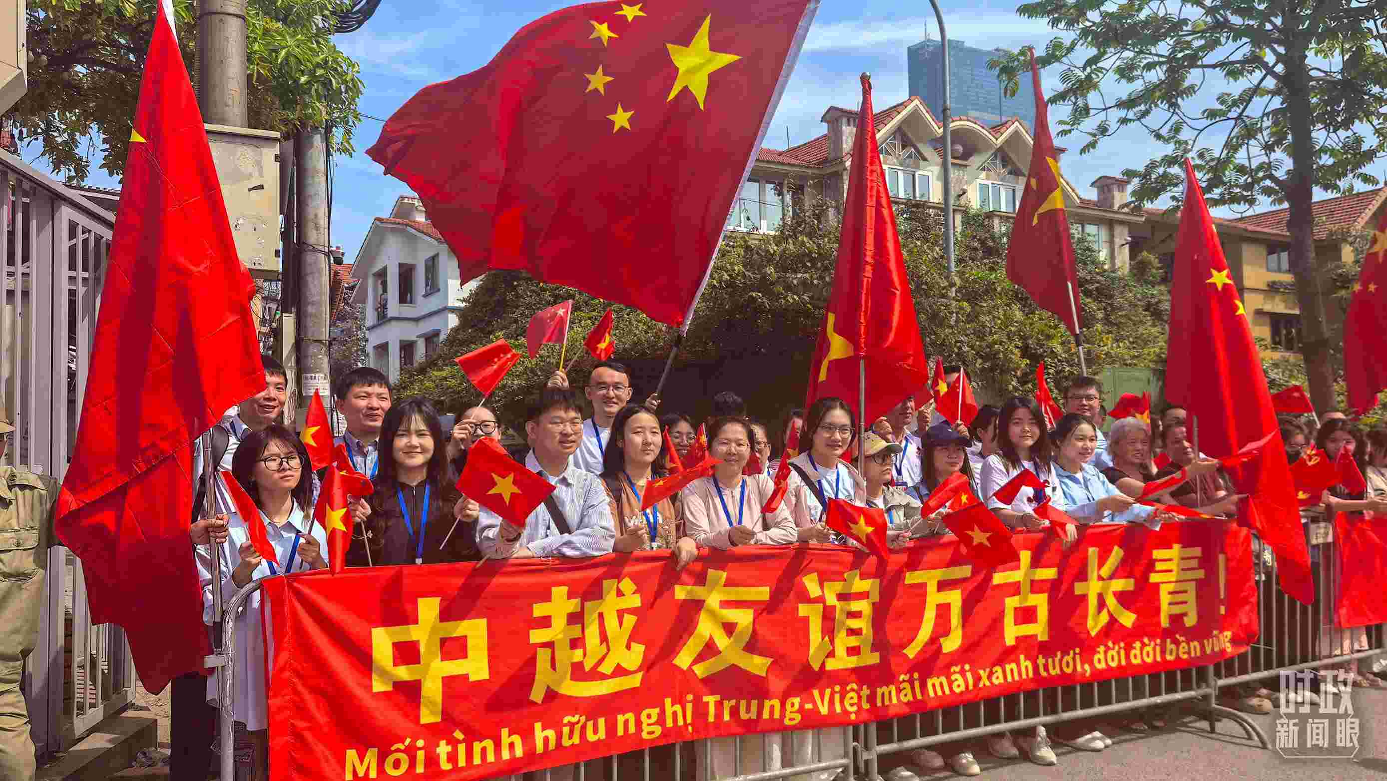 △ 民眾沿途揮舞中越國(guó)旗。(總臺(tái)央廣記者劉會(huì)民拍攝)
