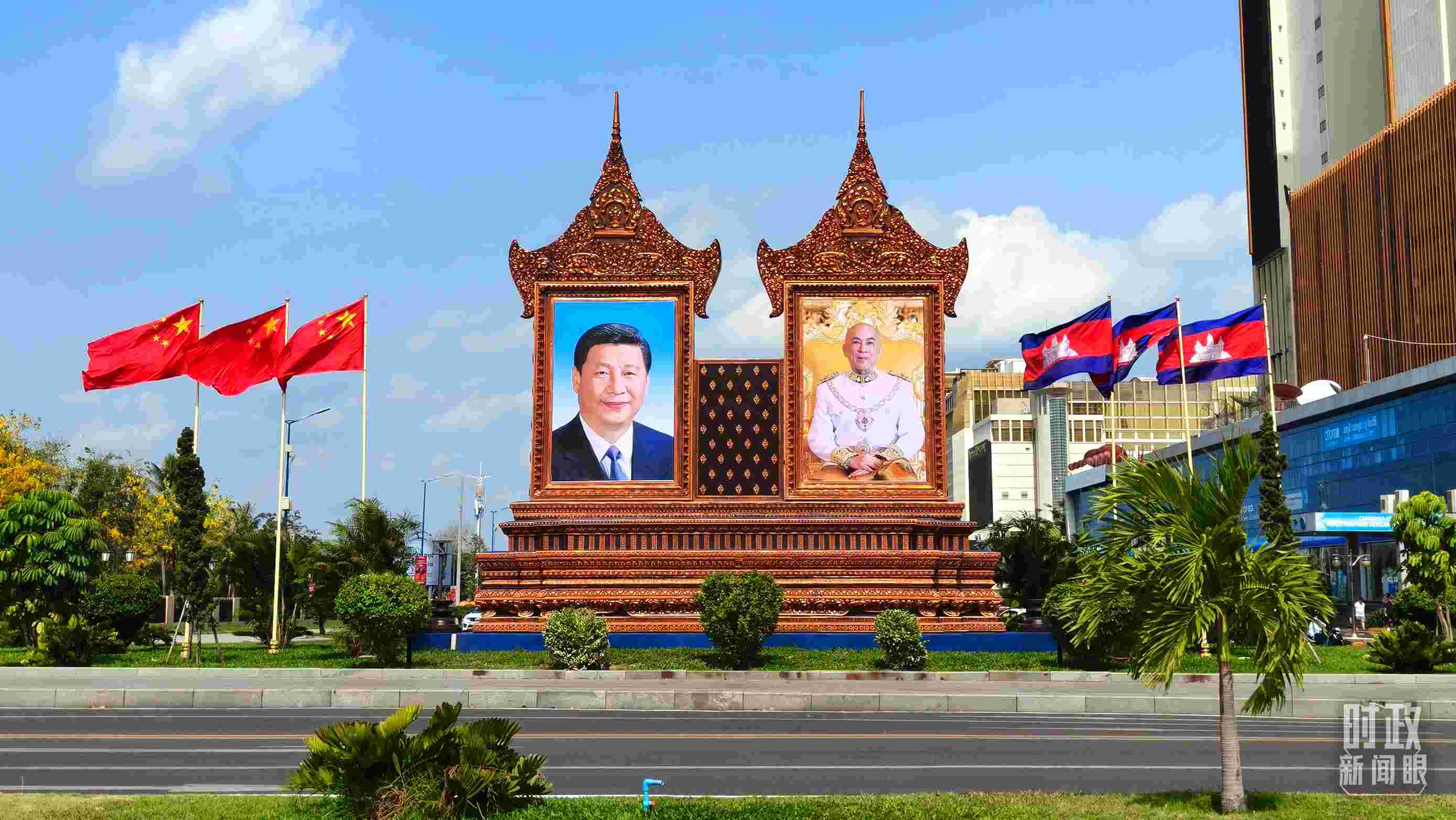 △金邊街頭的巨幅中柬兩國領導人照片和國旗。(總臺央視記者陸泓宇拍攝)