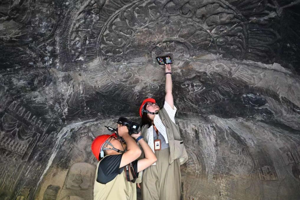 4月10日,龍門石窟研究院工作人員(右)與武漢大學(xué)文化遺產(chǎn)智能計(jì)算實(shí)驗(yàn)室團(tuán)隊(duì)成員一同對(duì)龍門石窟魏字洞進(jìn)行高清攝影掃描。新華社記者 李嘉南 攝